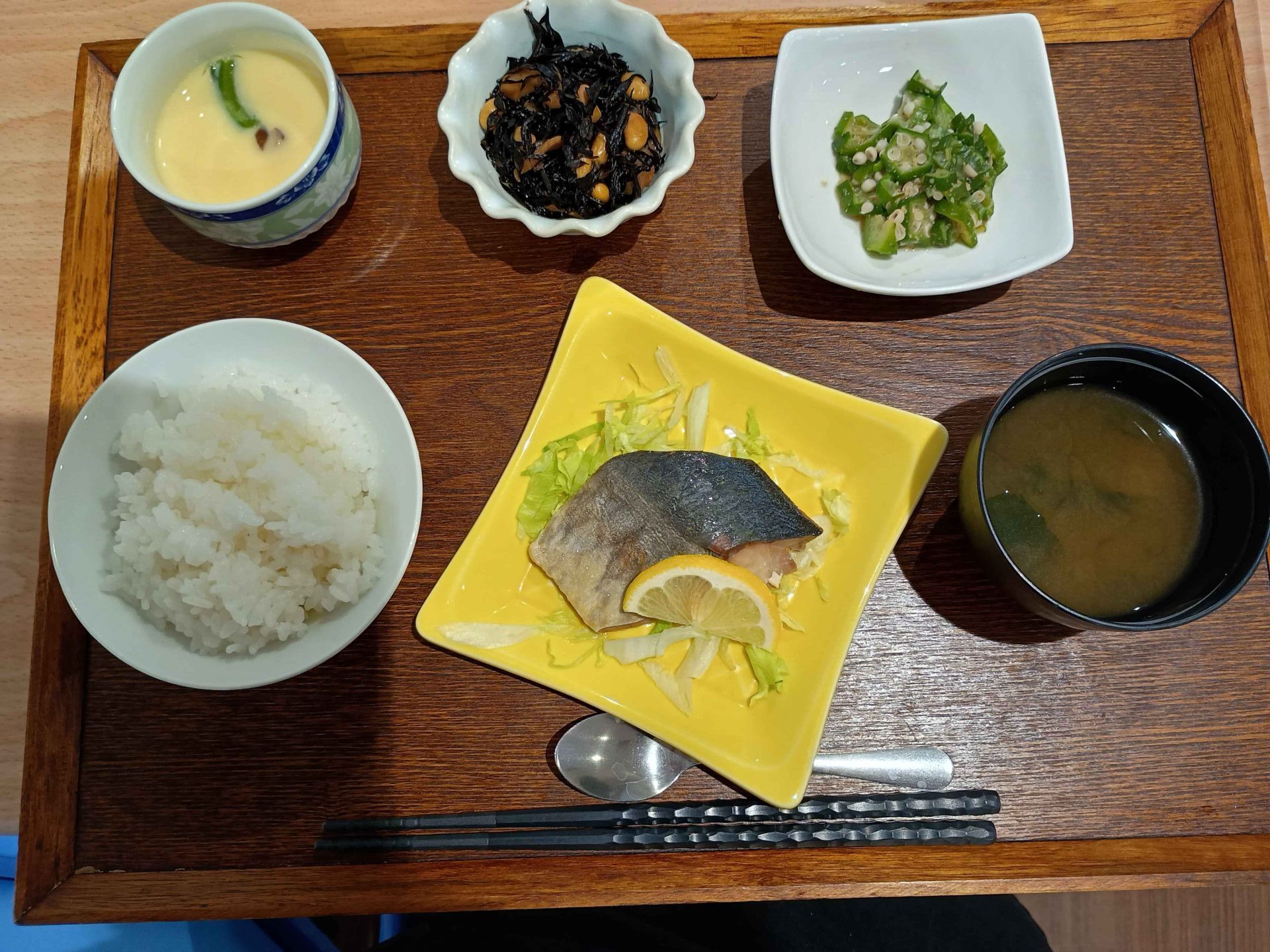 付け合わせは、ごはん・ひじき豆煮・オクラの胡麻和え・味噌汁・茶碗蒸しです。