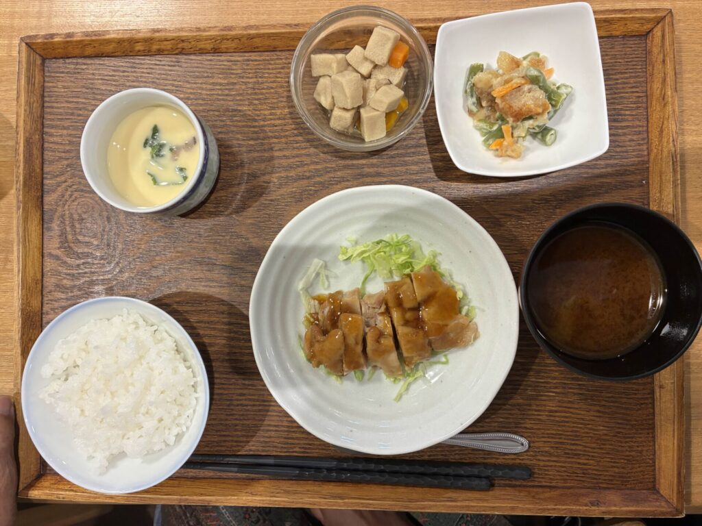 付け合わせは、ごはん・高野豆腐煮・いんげんおかかマヨ和え・味噌汁・茶碗蒸しです。