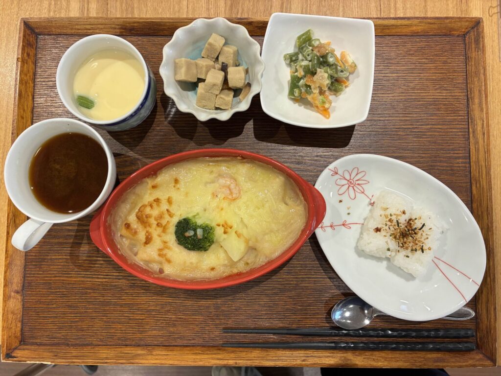 付け合わせは、おにぎり・高野豆腐煮・いんげんおかかマヨ和え・茶碗蒸しです。