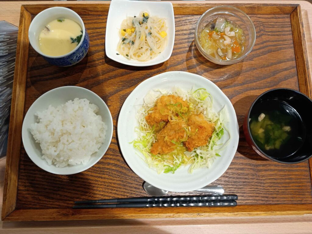 付け合わせは、ごはん・白菜とエビの中華煮・春雨の中華和え・中華スープ・茶碗蒸しです。