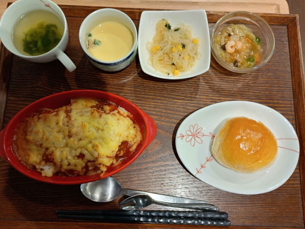 付け合わせは、パン(ごはんにも変更可能)・白菜とエビの中華煮・春雨の中華和え・中華スープです。