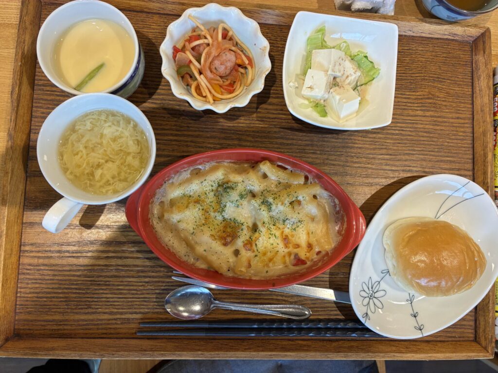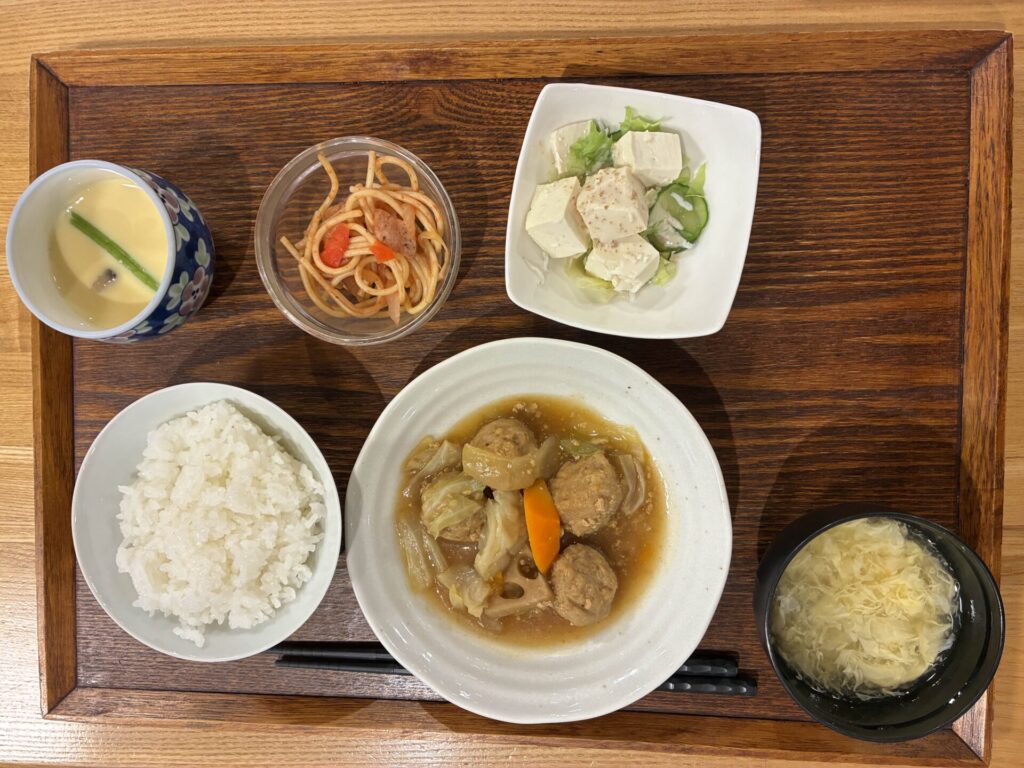 付け合わせは、ごはん・まろやかナポリタン・しらす香る豆腐サラダ・コンソメスープ・茶碗蒸しです。