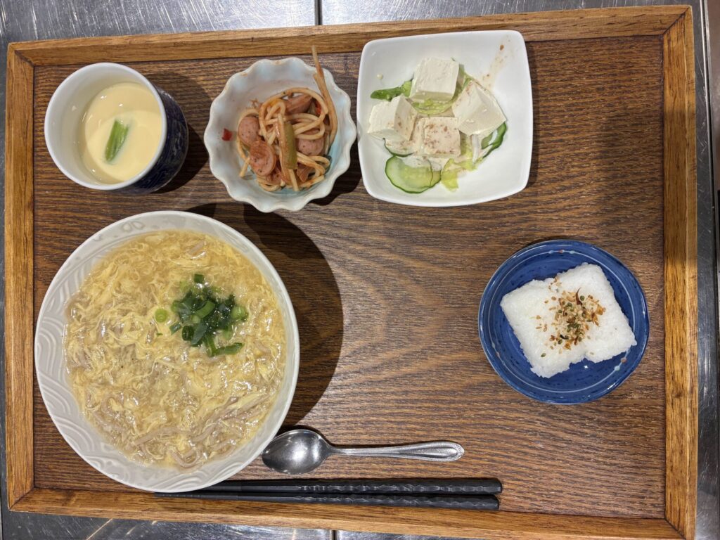 付け合わせは、おにぎり・まろやかナポリタン・しらす香る豆腐サラダ・茶碗蒸しです。