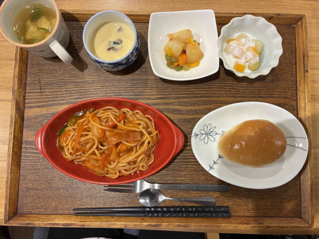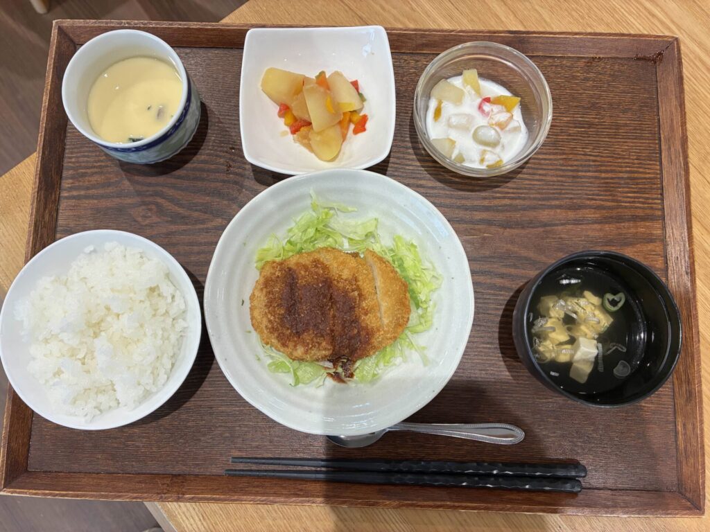 付け合わせは、ごはん・じゃが芋の金平・フルーツヨーグルト和え・コンソメスープ・茶碗蒸しです。
