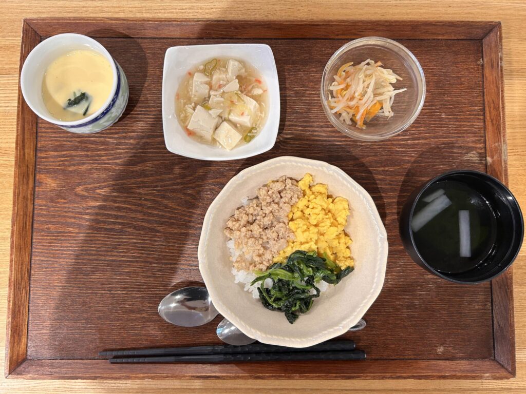 付け合わせは、おにぎり・豆腐のカニあんかけ・もやしのナムル・茶碗蒸しです。