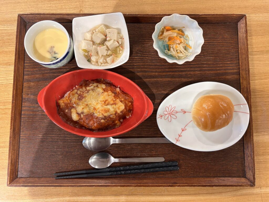 付け合わせは、パン(ごはんにも変更可能)・豆腐のカニあんかけ・もやしのナムル・中華スープです。