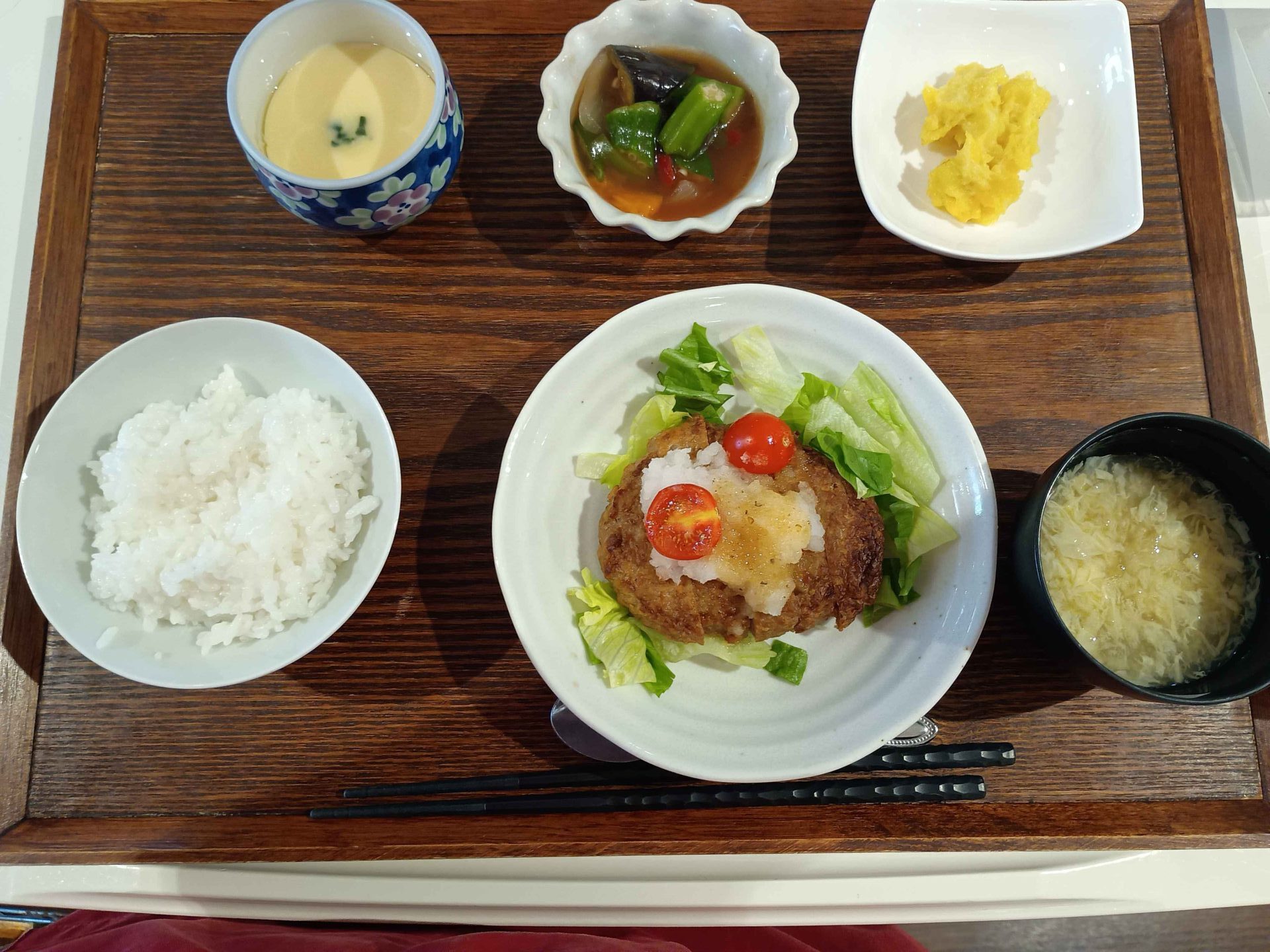 付け合わせは、ごはん・ラタトゥイユ・丸十サラダ・コンソメスープ・茶碗蒸しです。