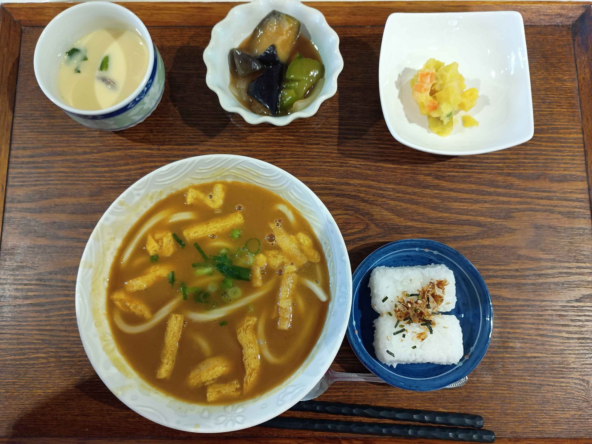 付け合わせは、おにぎり・ラタトゥイユ・丸十サラダ・茶碗蒸しです。