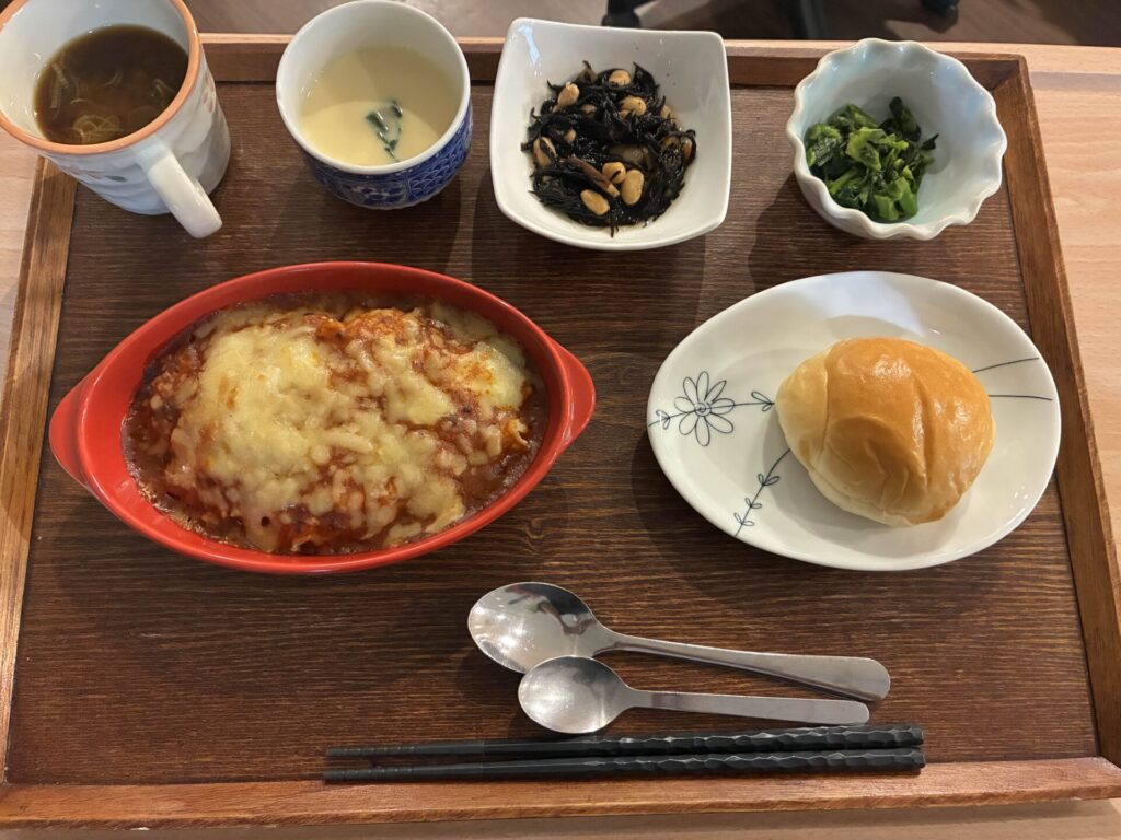 付け合わせは、パン(ごはんにも変更可能)・ひじき豆煮・菜の花のからし和え・味噌汁・茶碗蒸しです。