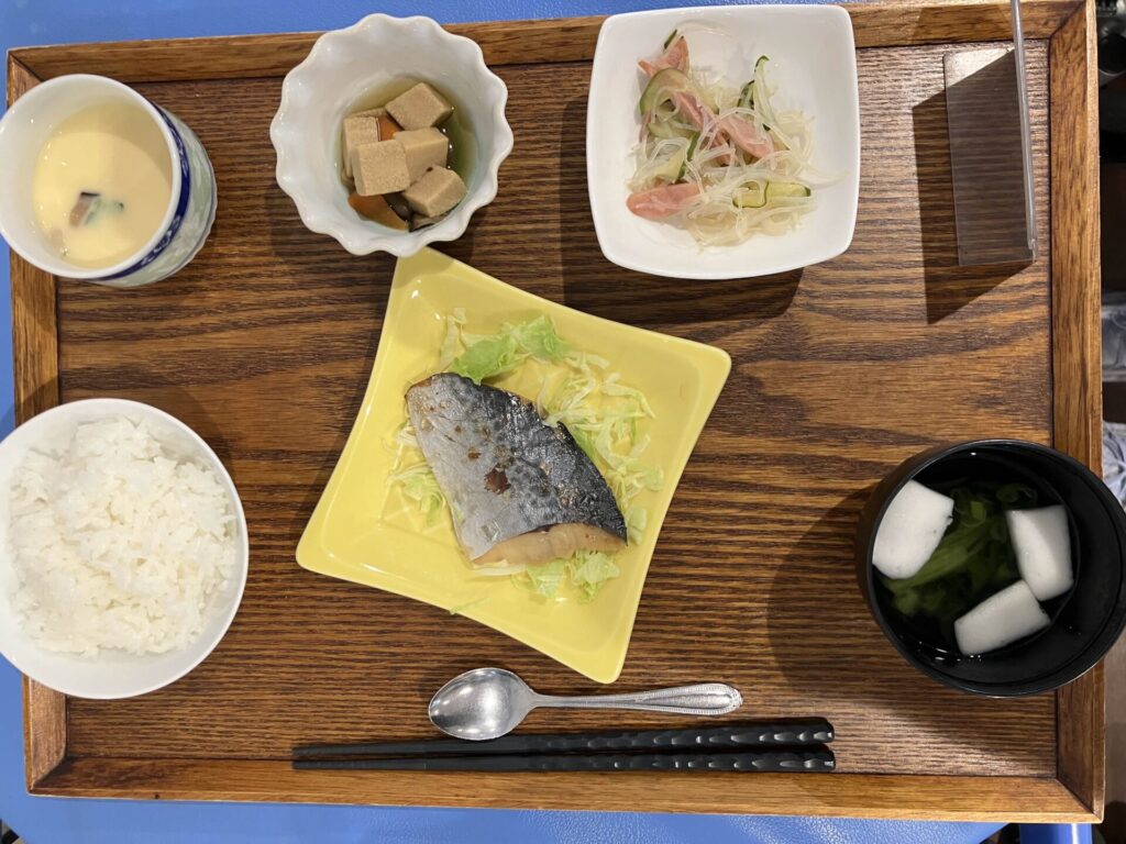 付け合わせは、ごはん・高野豆腐煮・春雨の中華和え・すまし汁・茶碗蒸しです。