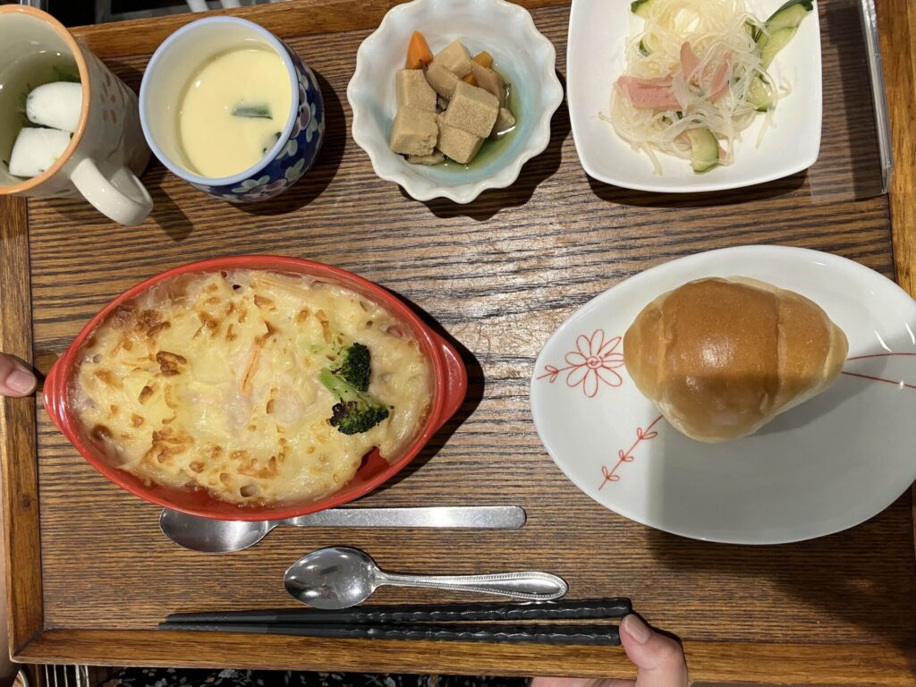 付け合わせは、パン(ごはんにも変更可能)・高野豆腐煮・春雨の中華和え・すまし汁・茶碗蒸しです。