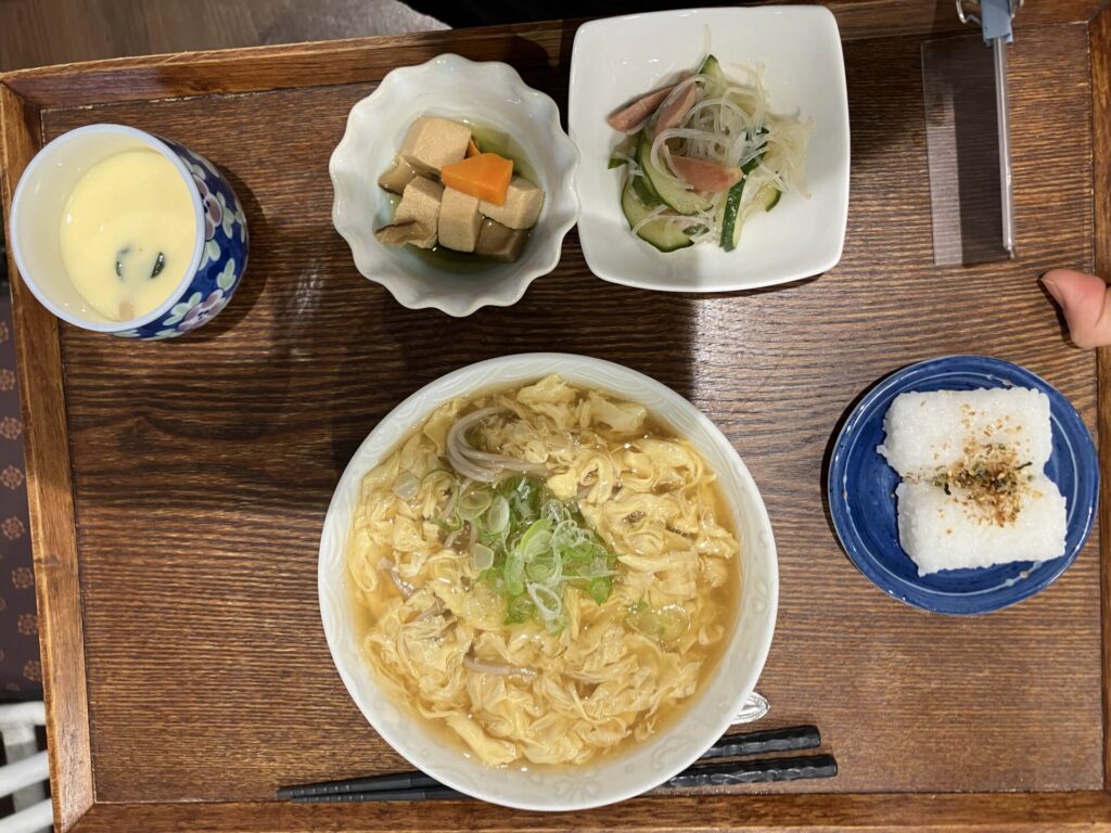 付け合わせは、おにぎり・高野豆腐煮・春雨の中華和え・茶碗蒸しです。