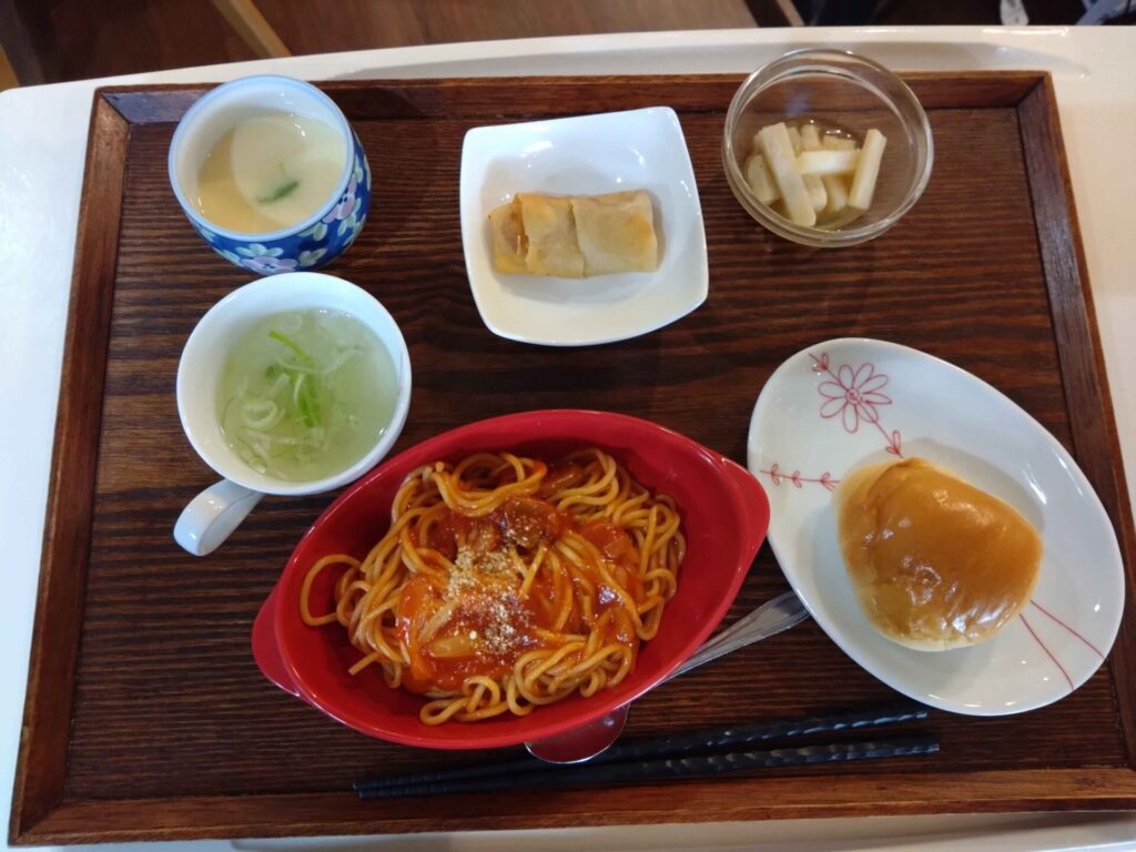 付け合わせ、パン(ごはんにも変更可能です)春巻き・長芋のわさび醬油和え・中華スープです。