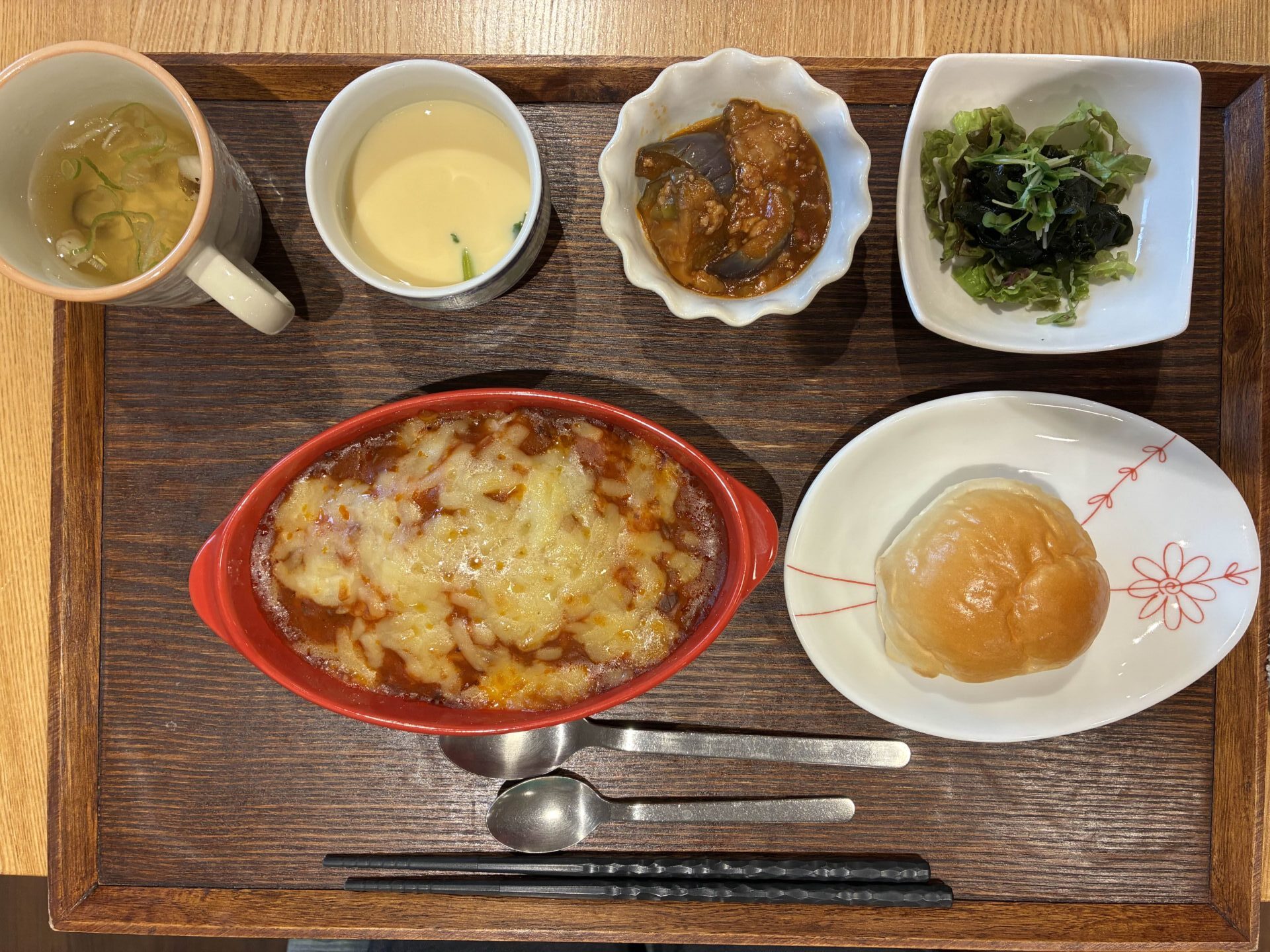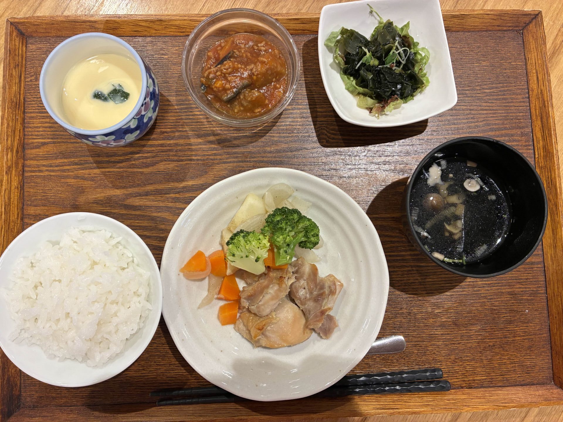 付け合わせは、ごはん・茄子のポロネーズ・海藻サラダ・コンソメスープ・茶碗蒸しです。