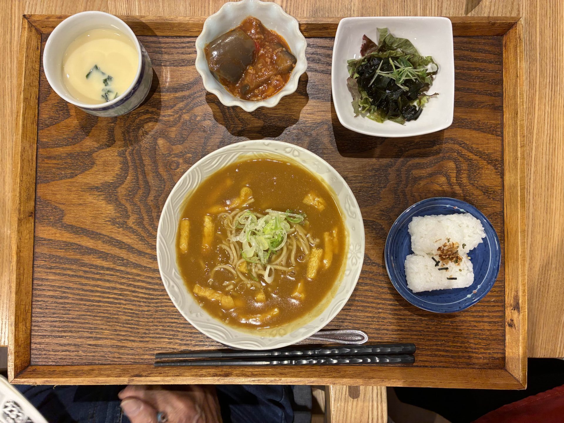 付け合わせは、おにぎり・茄子のポロネーズ・海藻サラダ・茶碗蒸しです。