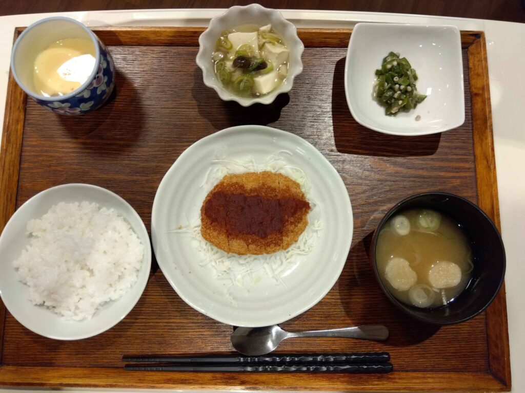 付け合わせは、ごはん・豆腐のきのこあん・オクラの胡麻和え・味噌汁・茶碗蒸しです。