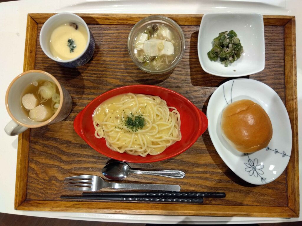 付け合わせ、パン(ごはんにも変更可能です)豆腐のきのこあん・オクラの胡麻和え・味噌汁です。