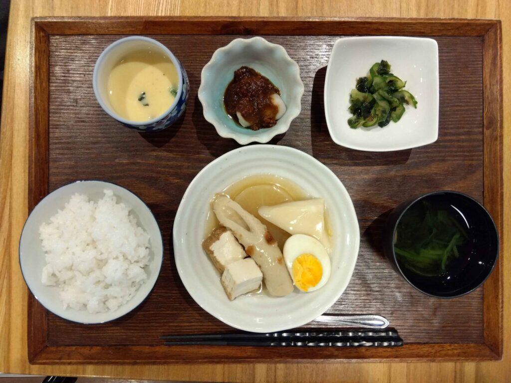 付け合わせは、ごはん・里芋の肉味噌かけ・胡瓜のおかか和え・すまし汁・茶碗蒸しです。