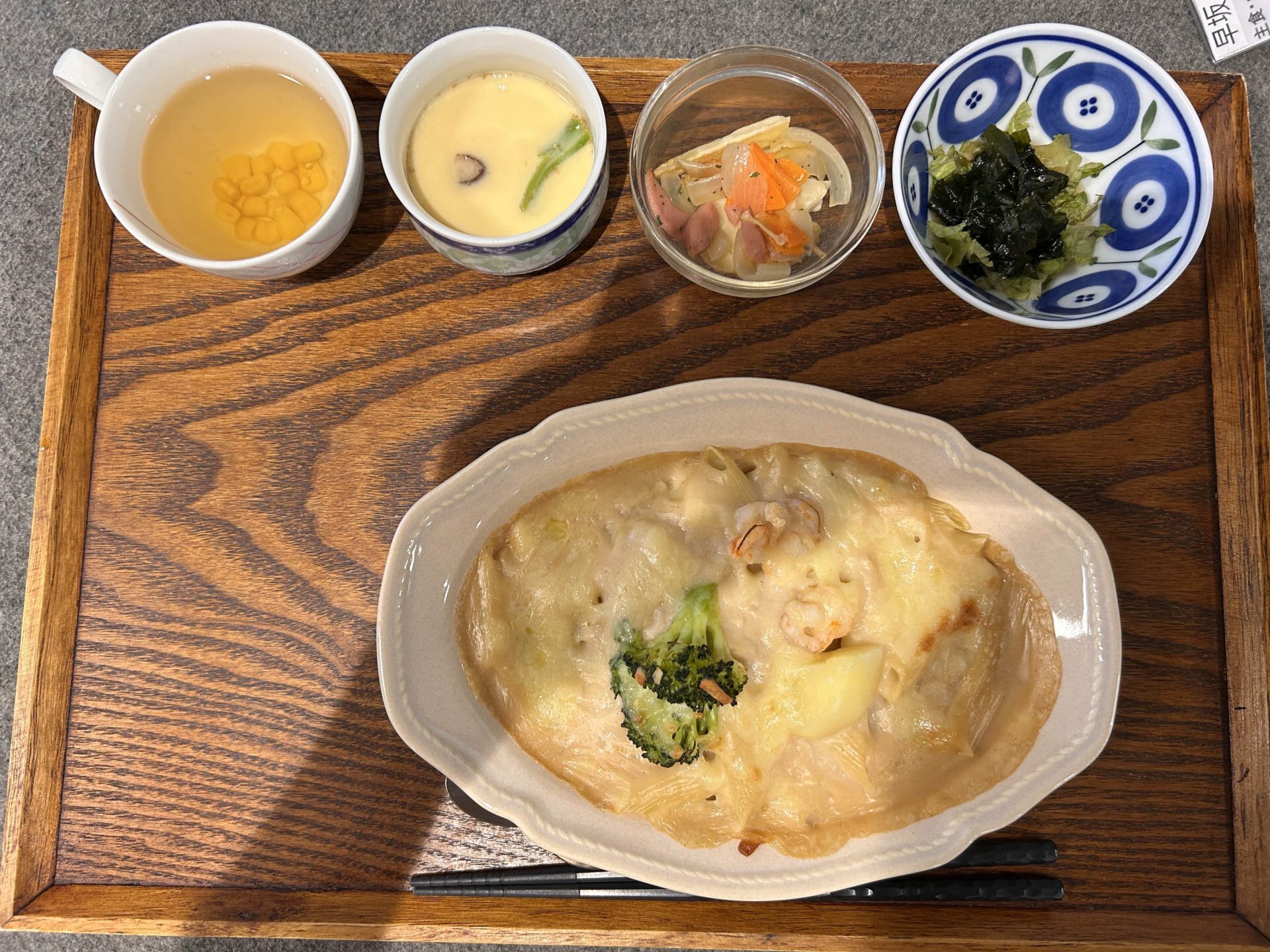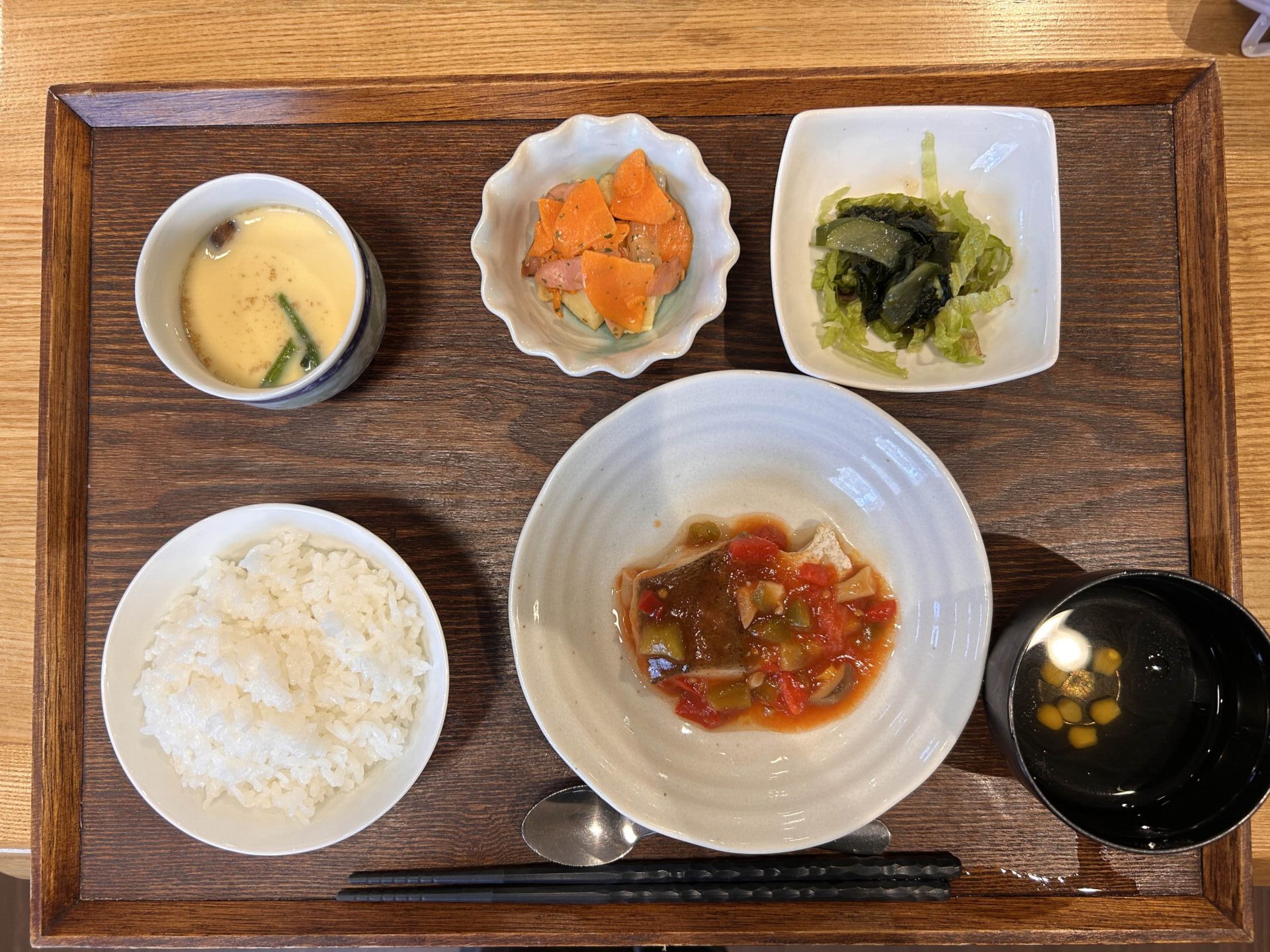 付け合わせは、ごはん・ジャーマンポテト・海藻サラダ・コンソメスープ・茶碗蒸しです。