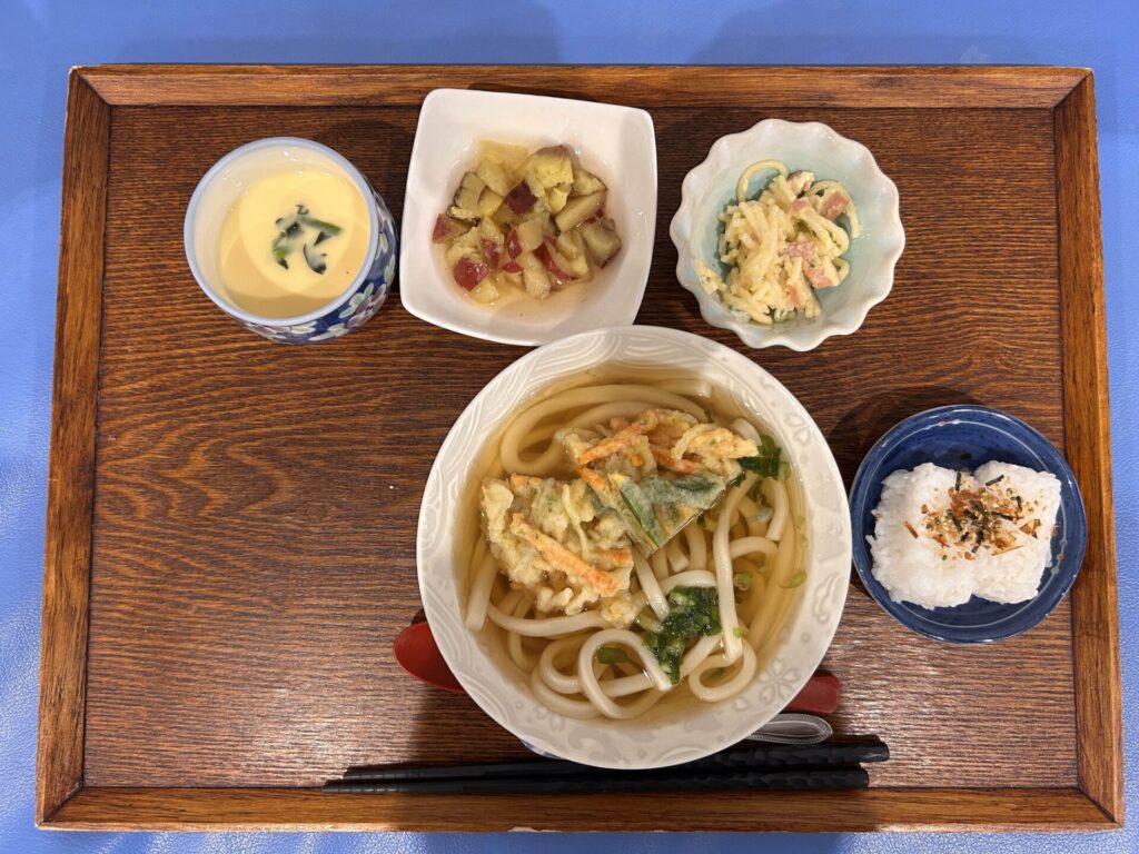 本日の麵定食は、「かきあげうどん(そばにも変更可能)」です。