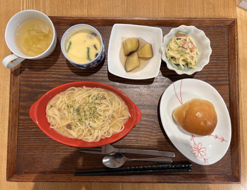 付け合わせは、パン(ごはんにも変更可能)・大学芋・スパゲッティサラダ・コンソメスープ・茶碗蒸しです。