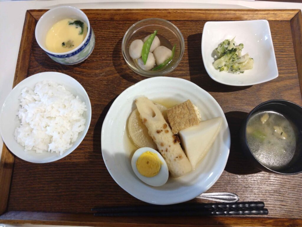 付け合わせは、ごはん・里芋の煮っ転がし・ブロッコリーのサラダ・味噌汁・茶碗蒸しです。
