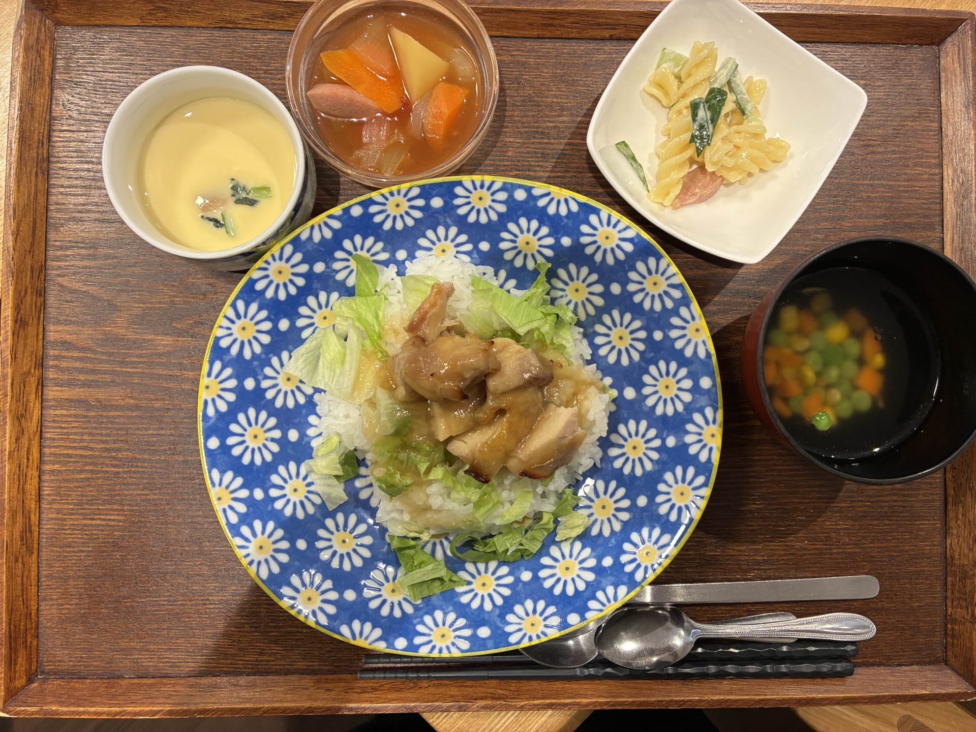 付け合わせは、ごはん・ポトフ煮・マカロニサラダ・コンソメスープ・茶碗蒸しです。