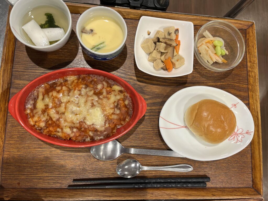付け合わせ、パン(ごはんにも変更可能です)高野豆腐煮・根菜の胡麻だれサラダ・すまし汁です。