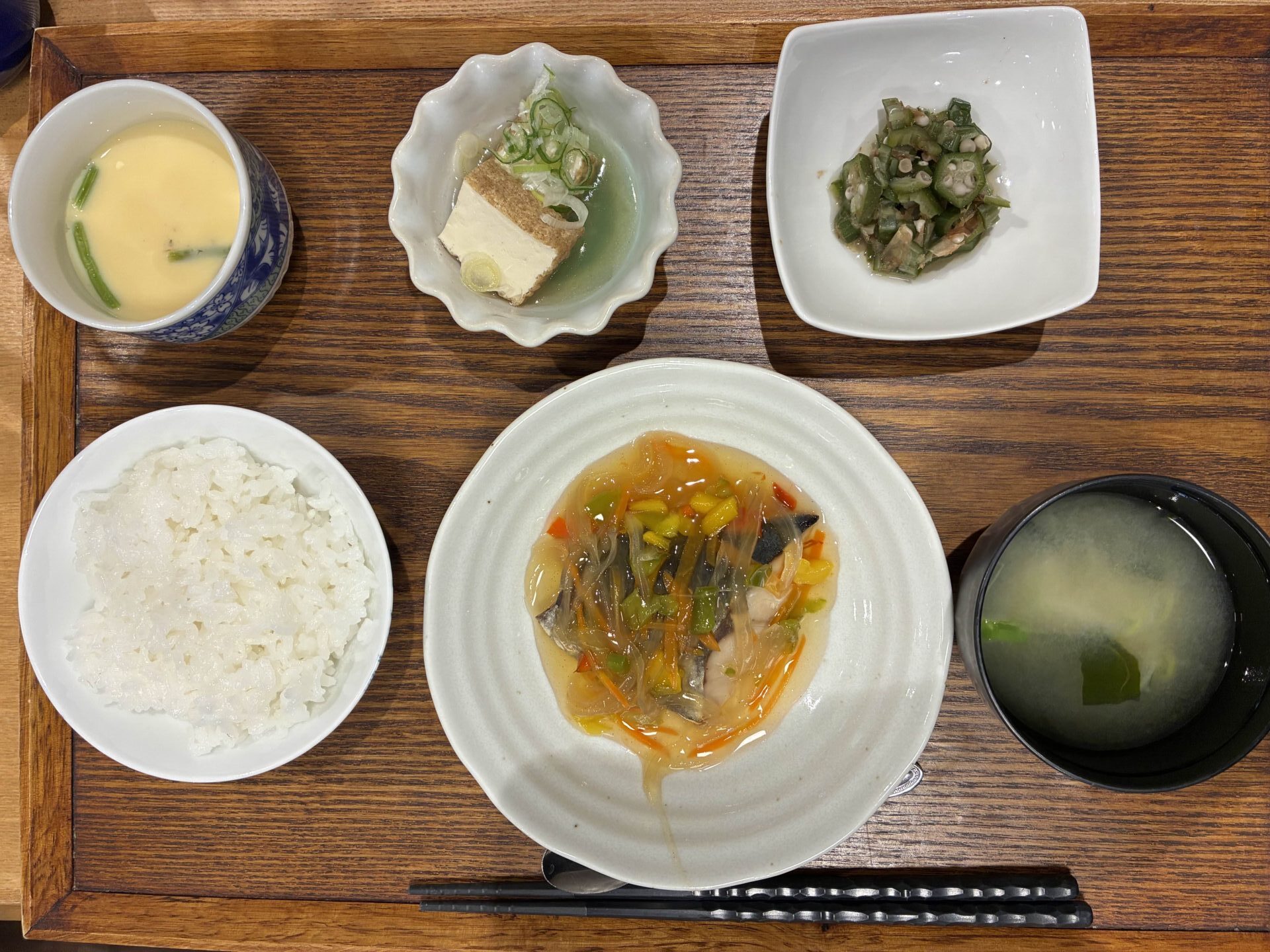 付け合わせは、ごはん・厚揚げの甘辛煮・オクラのおかか和え・味噌汁・茶碗蒸しです。