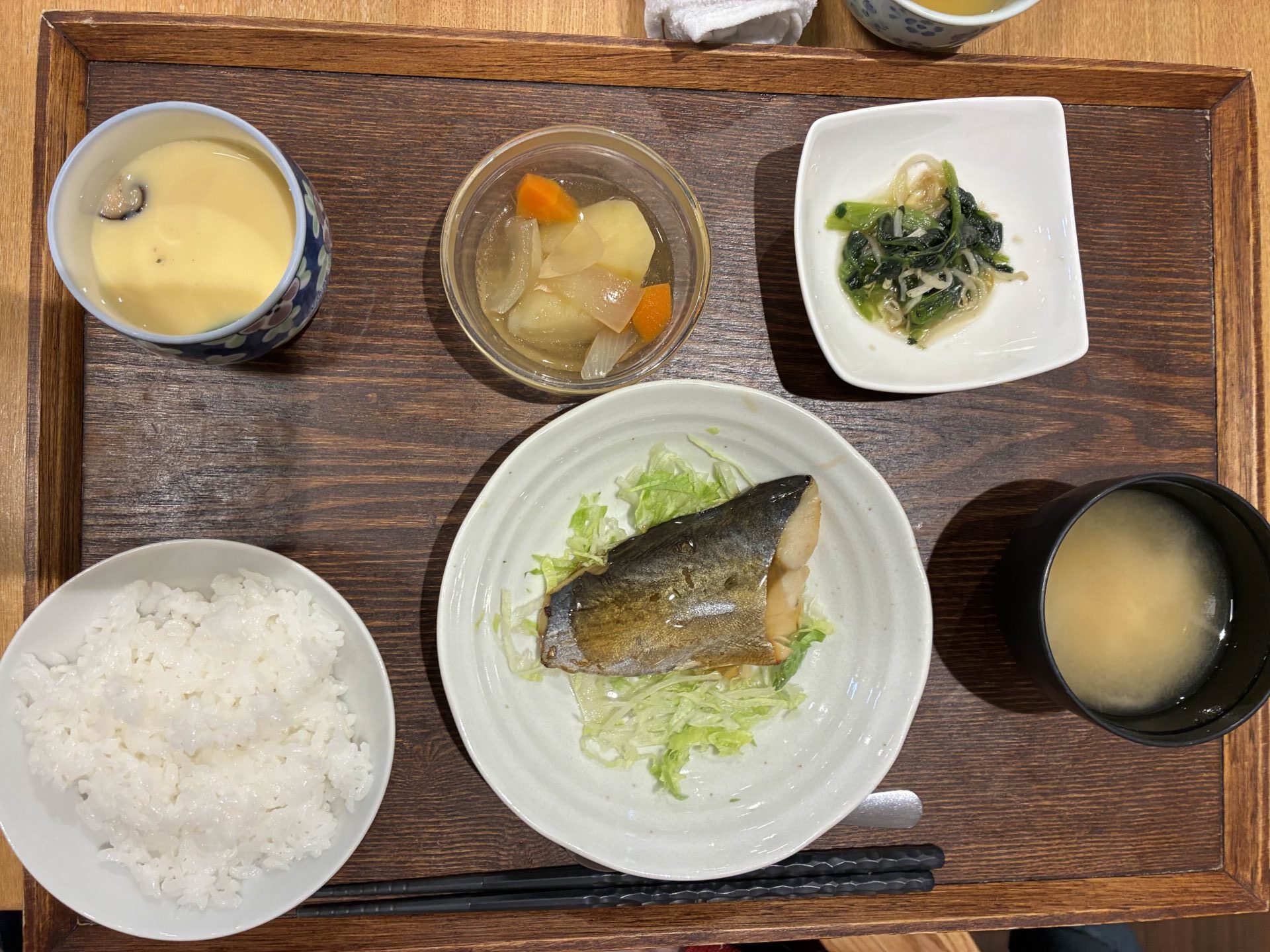 付け合わせは、ごはん・ツナじゃが煮・もやしのお浸し・味噌汁・茶碗蒸しです。
