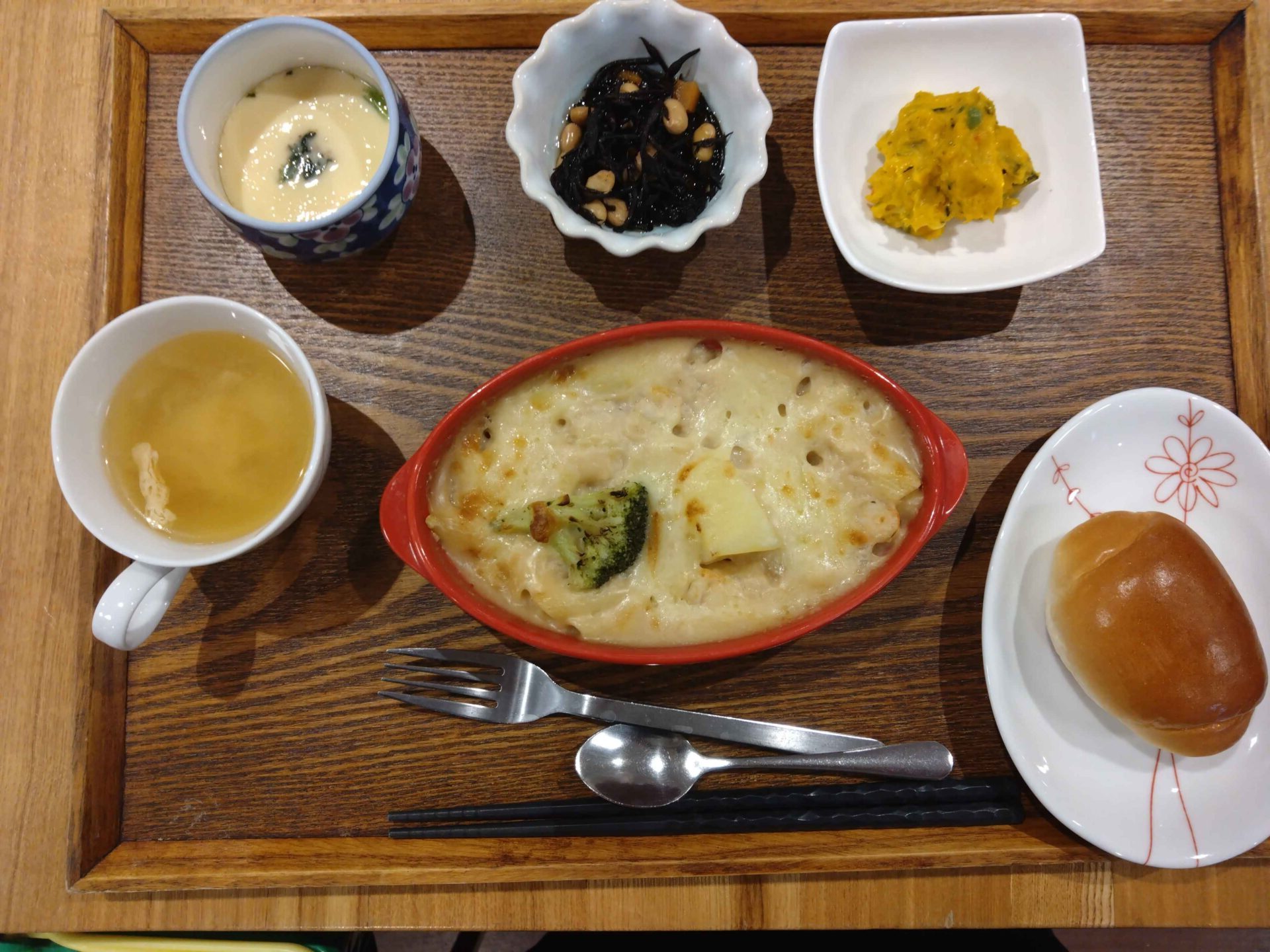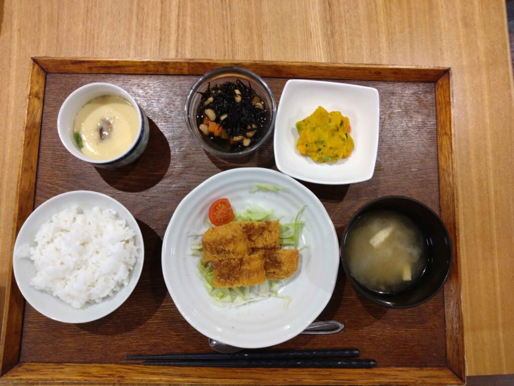 付け合わせは、ひじき煮、かぼちゃサラダ、味噌汁、ごはん・茶碗蒸しです。