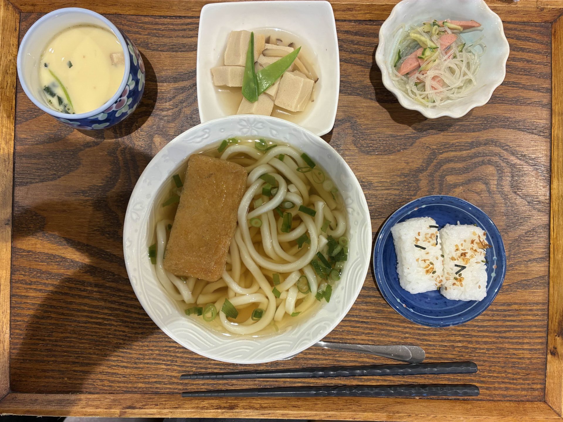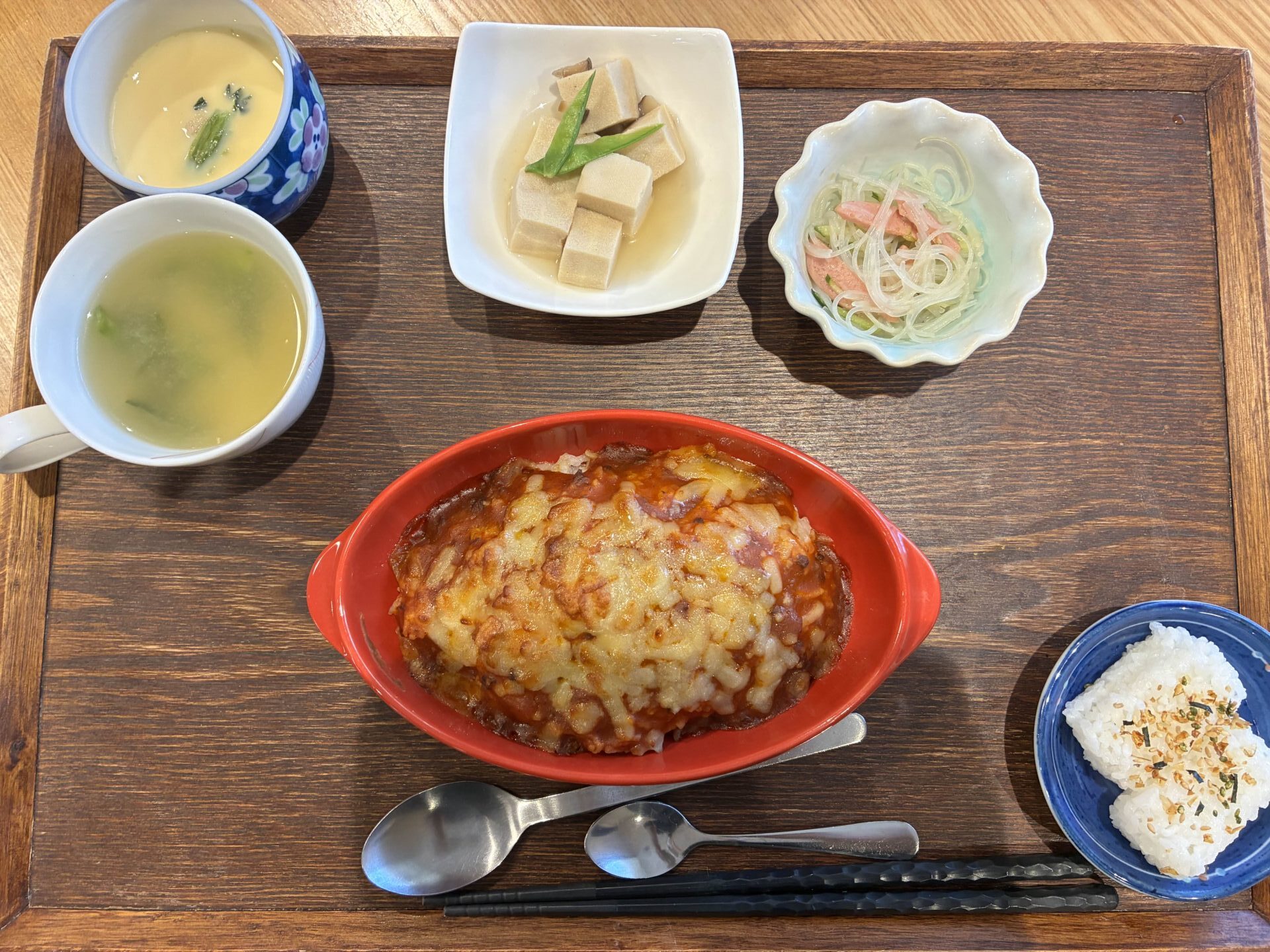 付け合わせは、おにぎり・高野豆腐煮・春雨の酢の物・茶碗蒸しです。