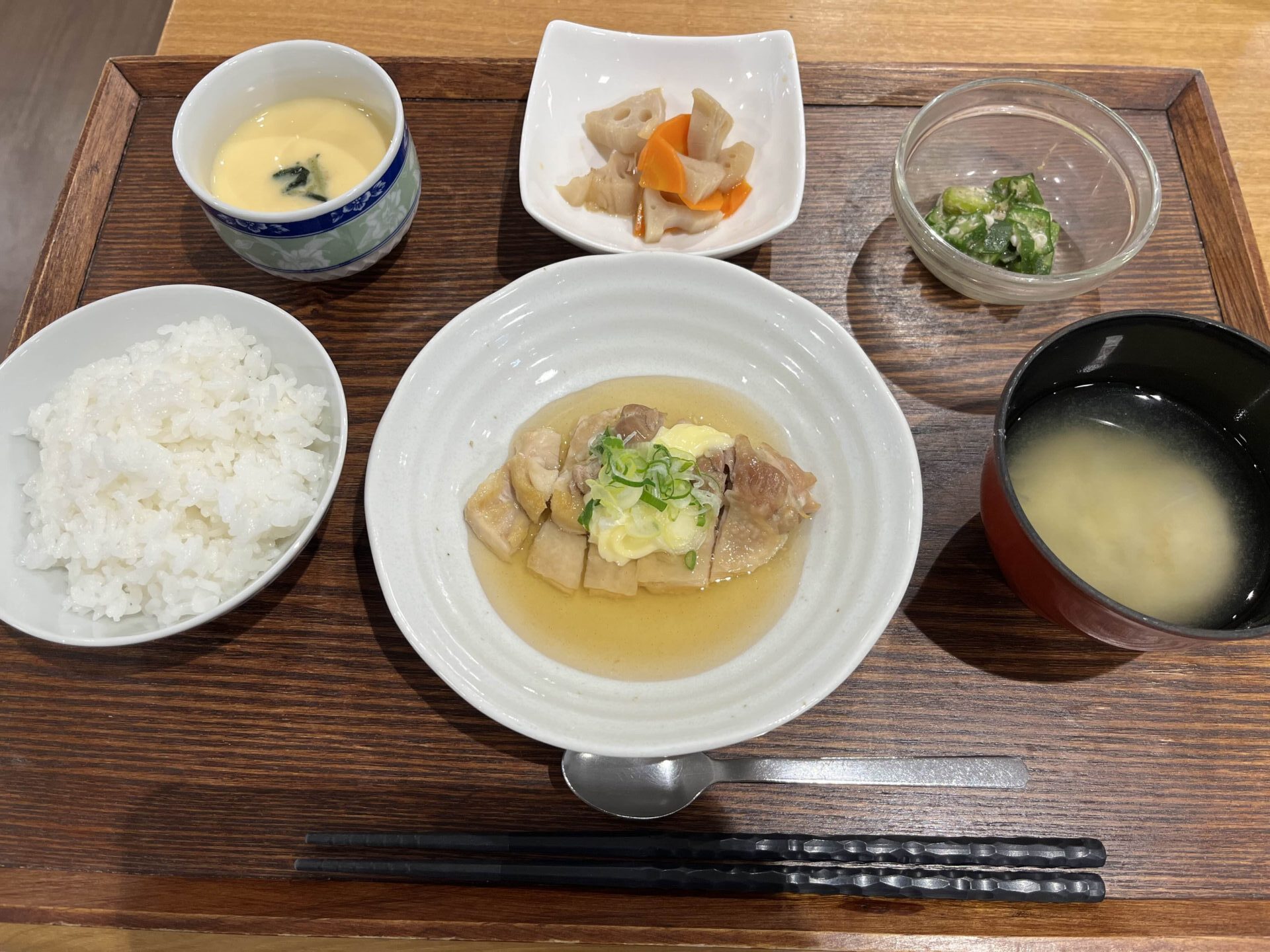 付け合わせは、ごはん・きんぴらレンコン・オクラのおかか和え・味噌汁・茶碗蒸しです。