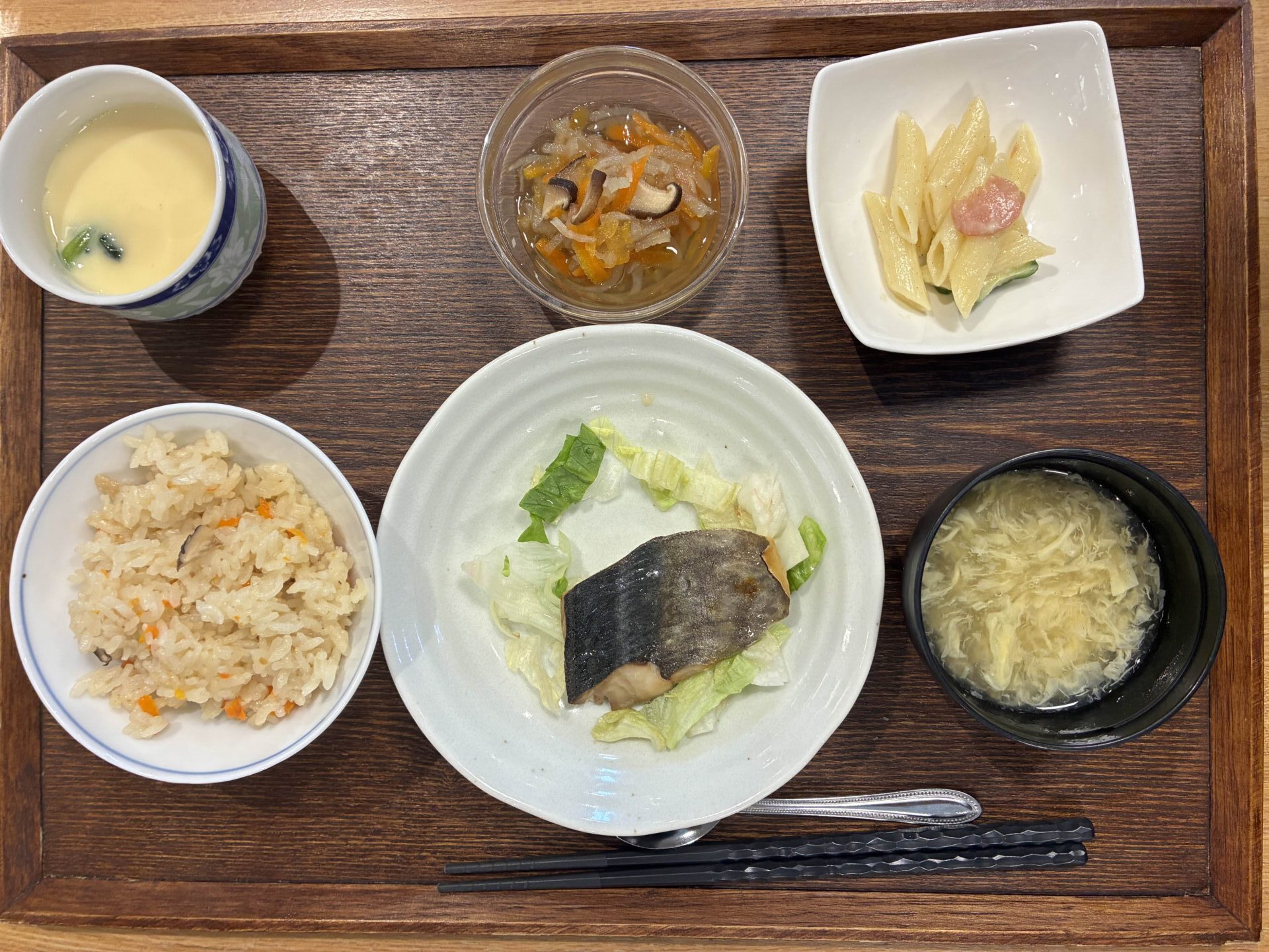付け合わせは、ごはん・切干大根煮・マカロニサラダ・すまし汁・茶碗蒸しです。