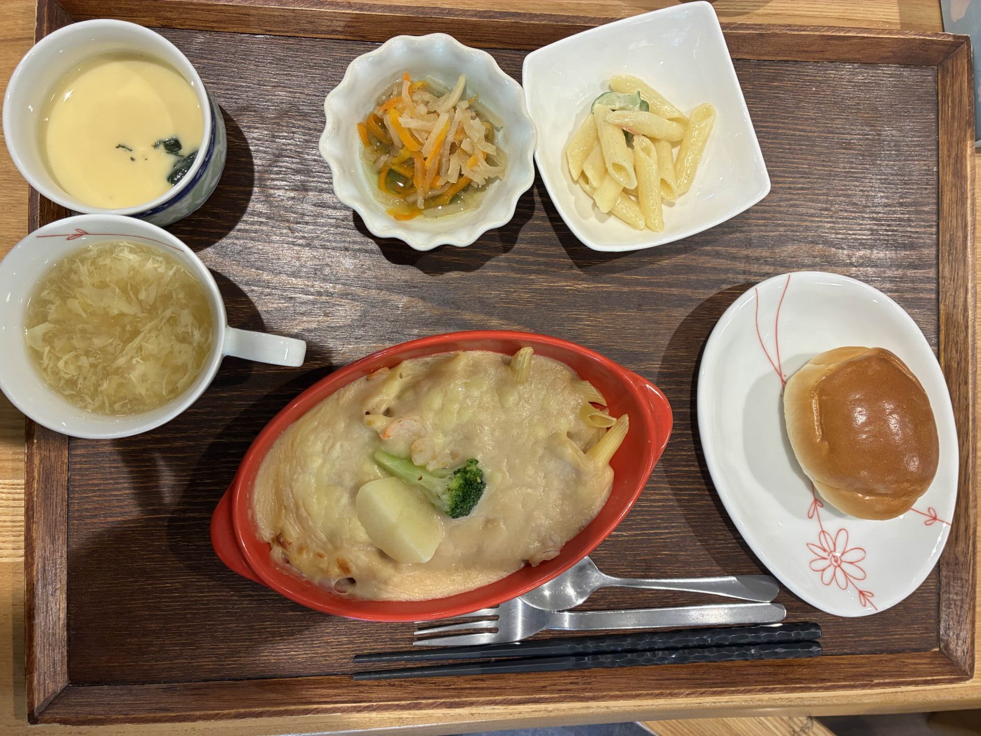 付け合わせ、パン(ごはんにも変更可能です)切干大根煮・マカロニサラダ・すまし汁です。