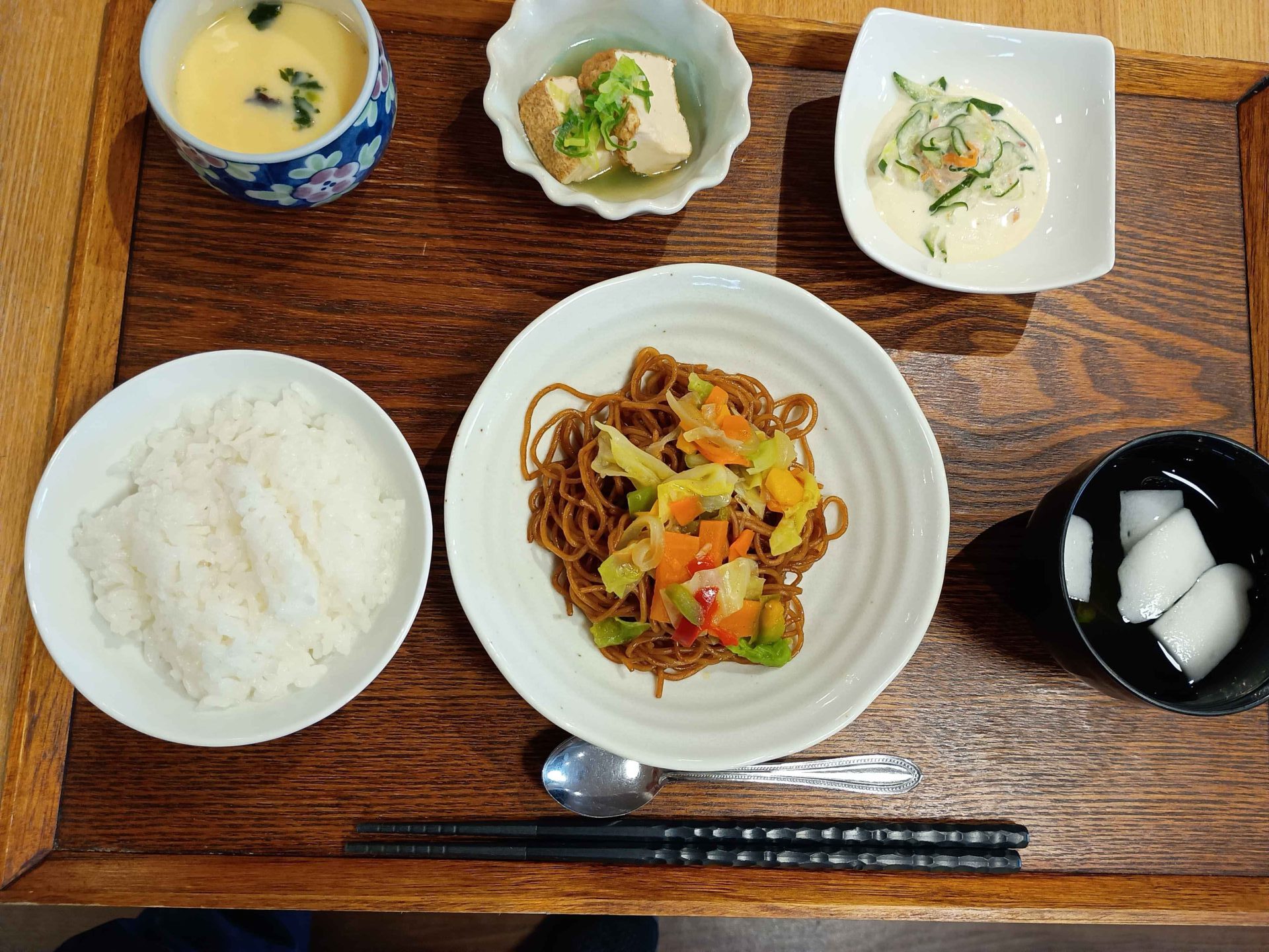付け合わせは、おにぎり・厚揚げの甘辛煮・胡瓜とツナのマヨ和え・茶碗蒸しです。