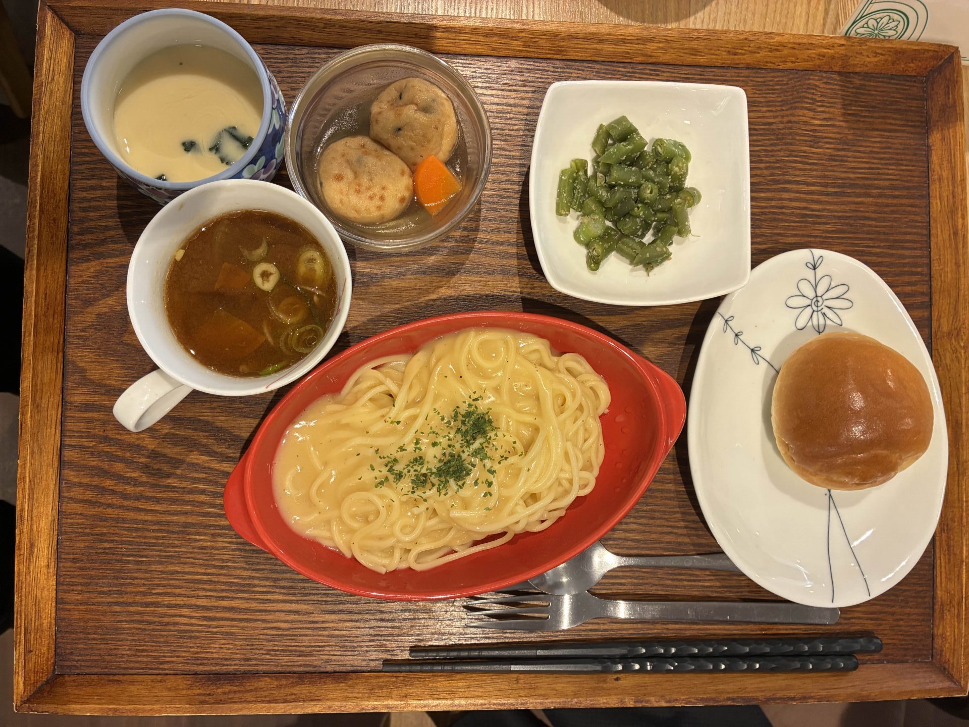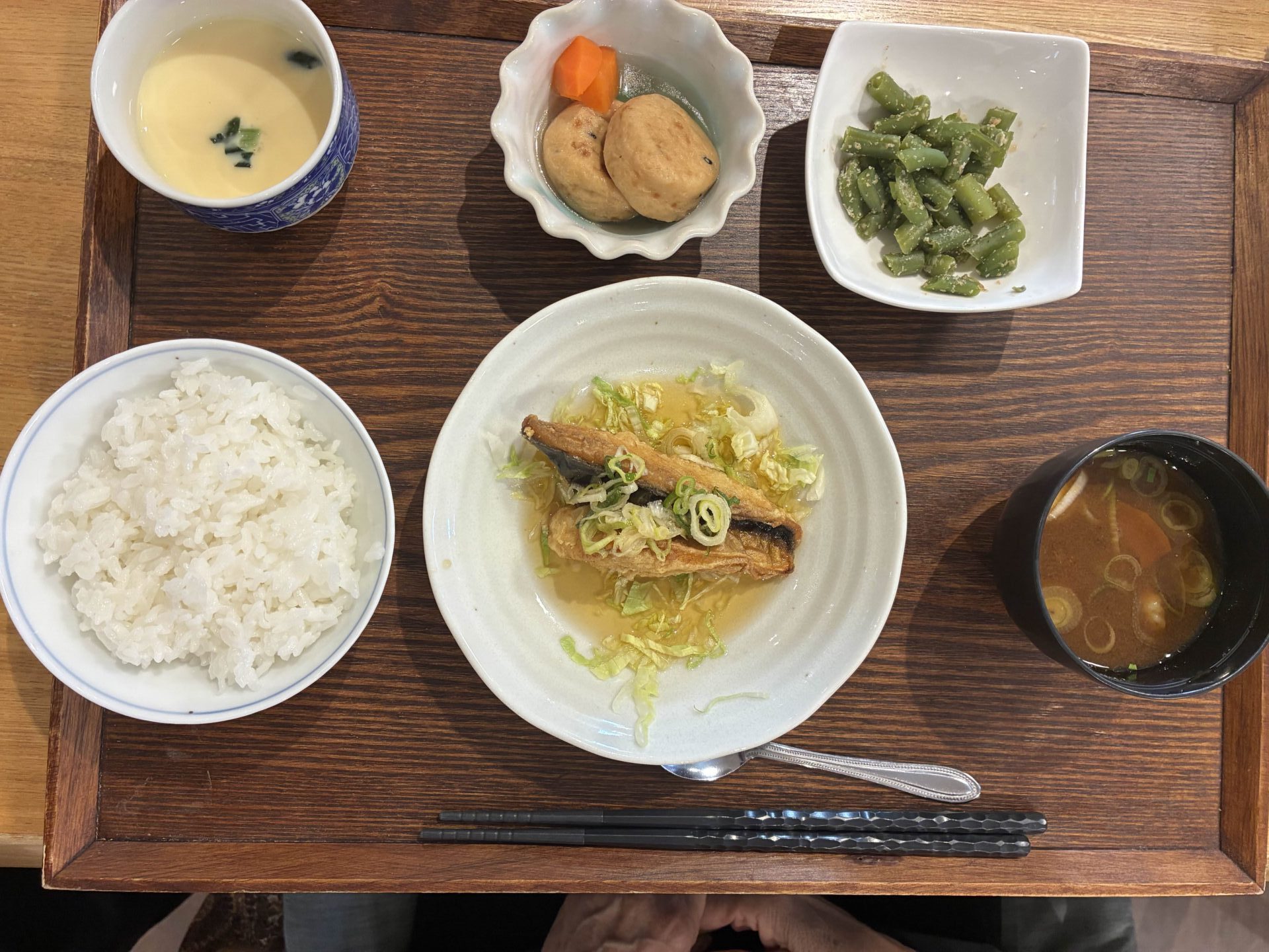 付け合わせは、ごはん・がんも煮・いんげんのピーナッツ和え・豚汁・茶碗蒸しです。