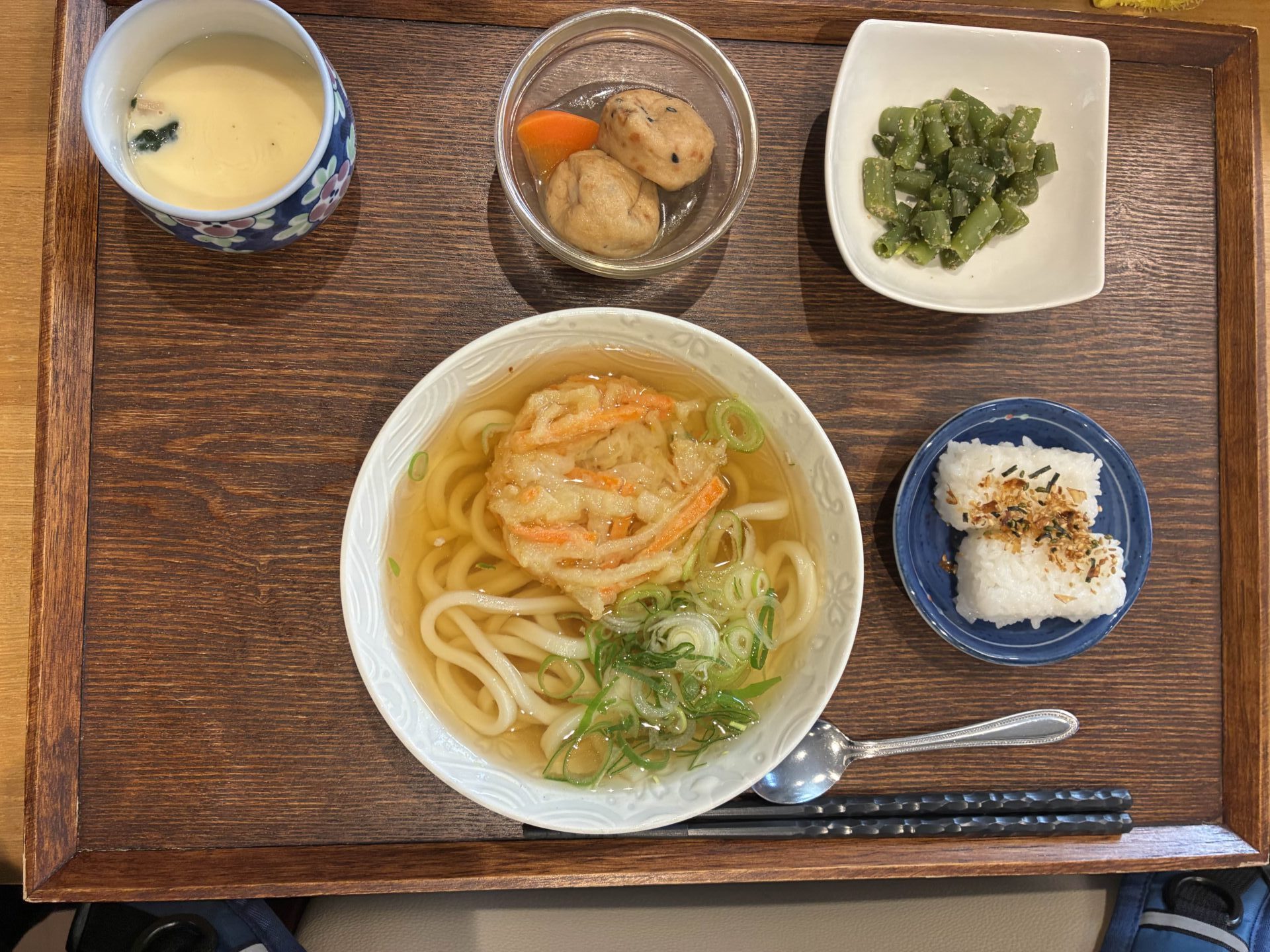付け合わせは、おにぎり・がんも煮・いんげんのピーナッツ和え・茶碗蒸しです。