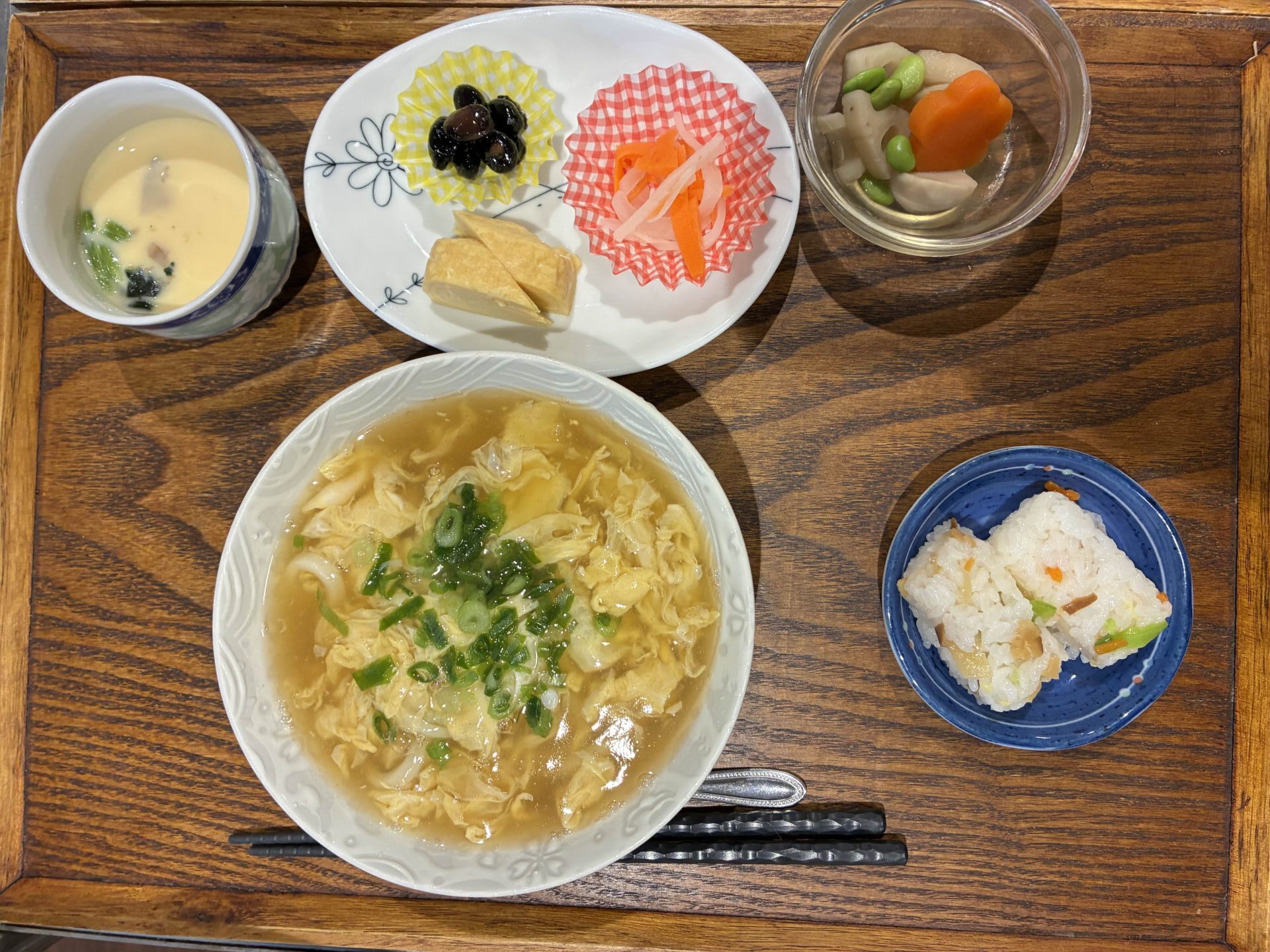 付け合わせは、おにぎり・根菜の炊き合わせ・三種盛り・茶碗蒸しです。