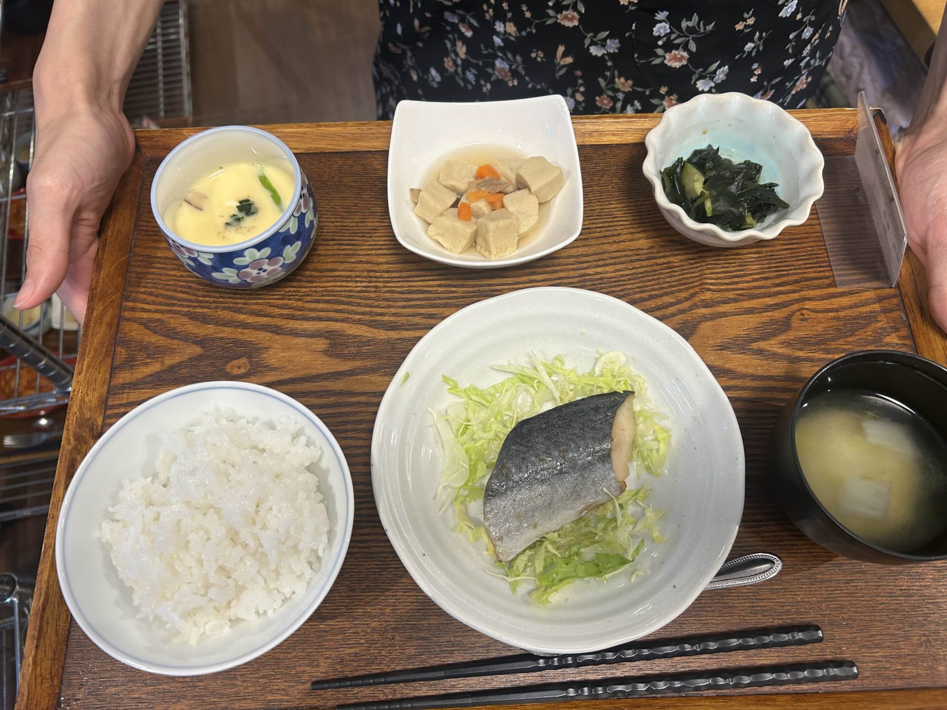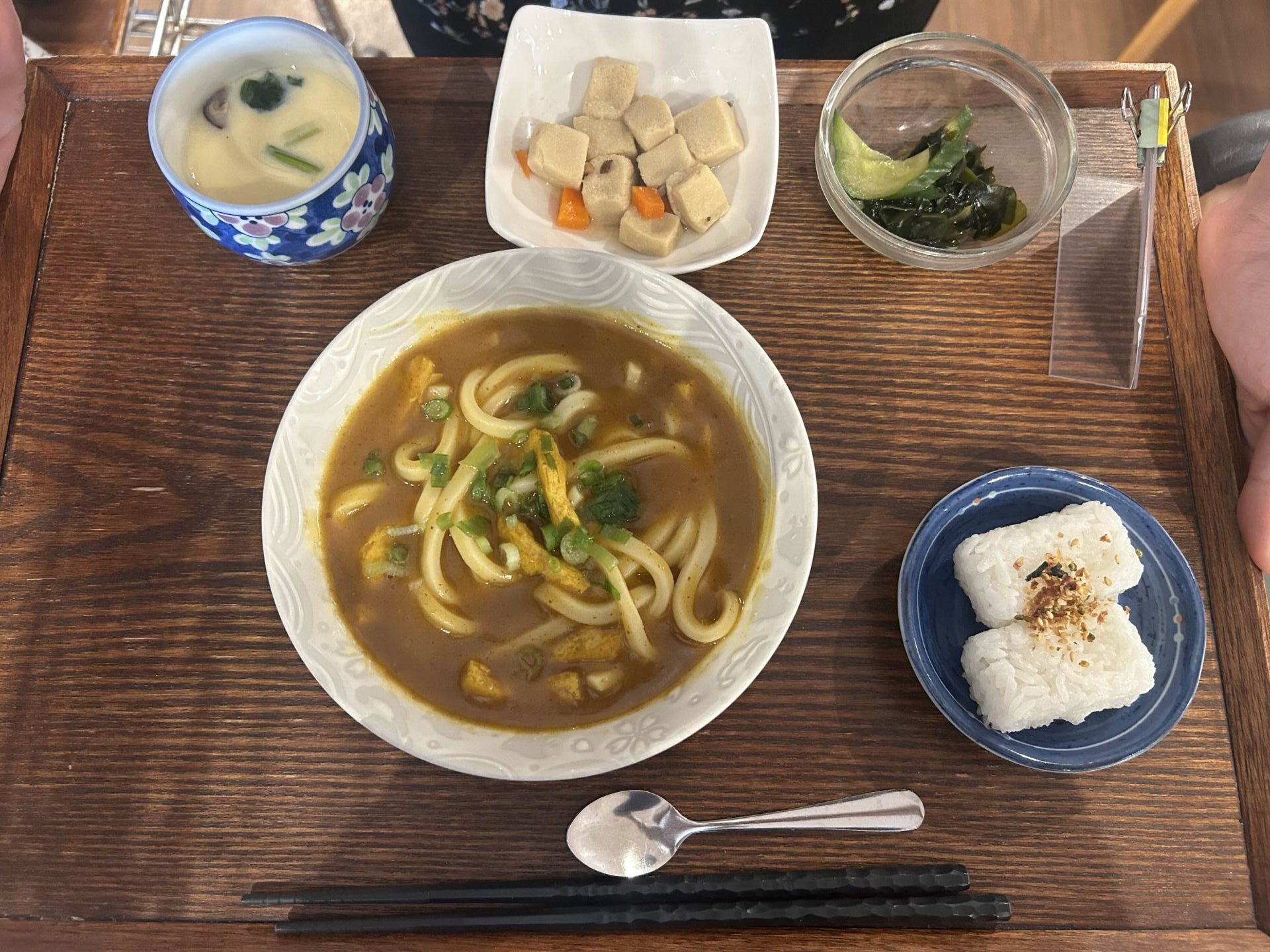 付け合わせは、おにぎり・高野豆腐煮・胡瓜とワカメの酢の物・茶碗蒸しです。