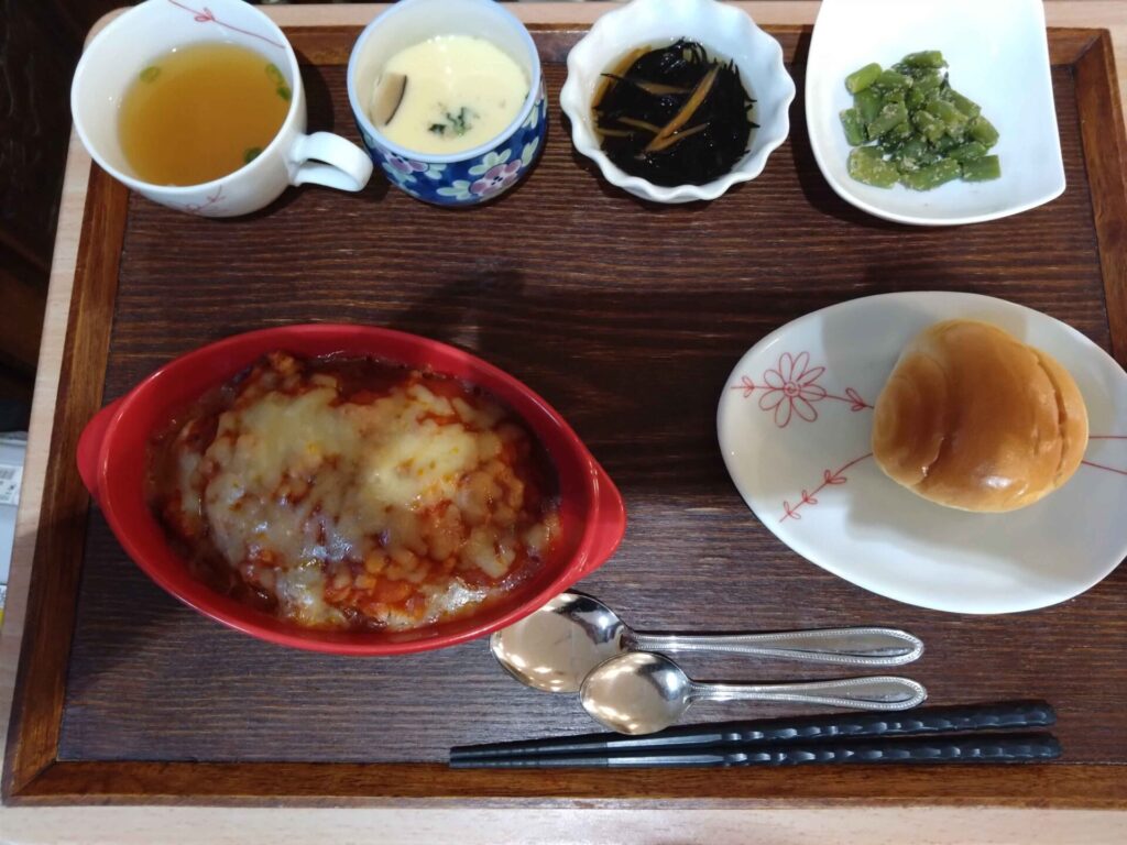 付け合わせは、ごはん・ひじき煮・いんげんのピーナッツ和え・味噌汁・茶碗蒸しです。