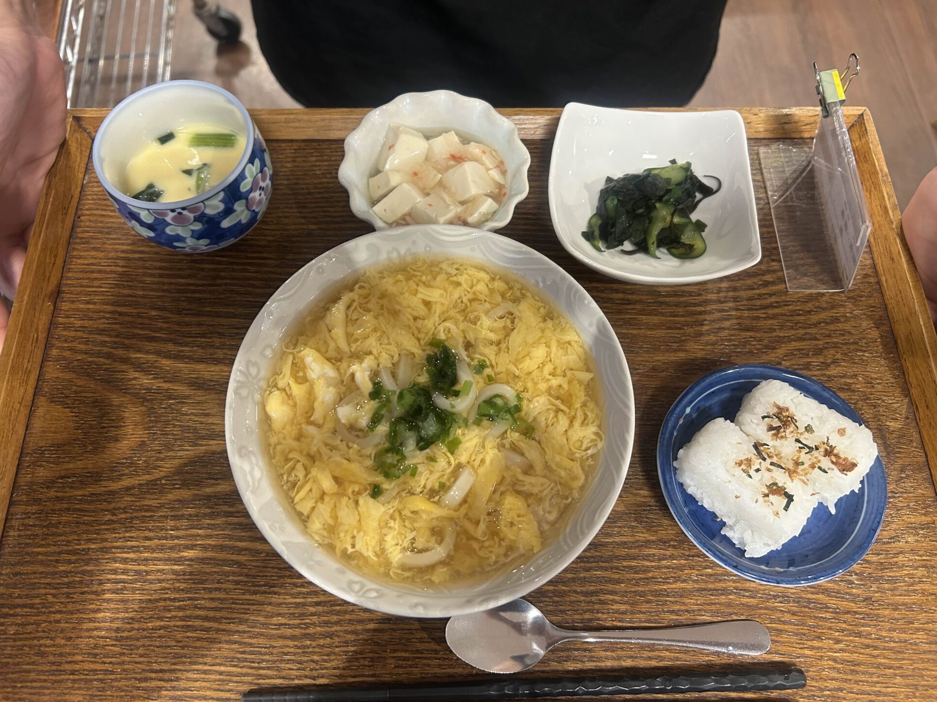 付け合わせは、おにぎり・豆腐とカニカマのとろみ煮・胡瓜の塩昆布和え・茶碗蒸しです。