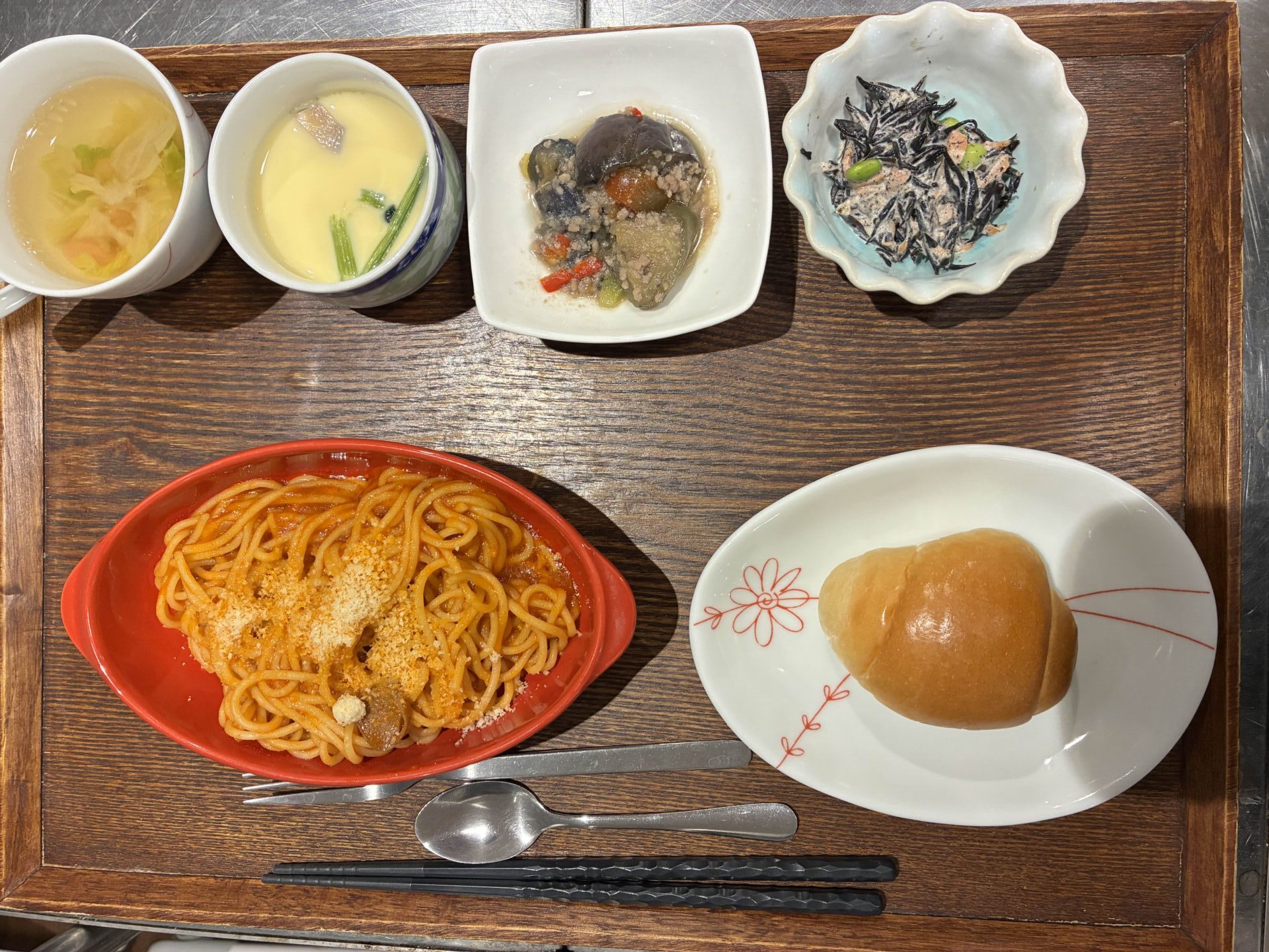 付け合わせは、ごはん・茄子のボロネーゼ・ひじきと枝豆のサラダ・コンソメスープ・茶碗蒸しです。