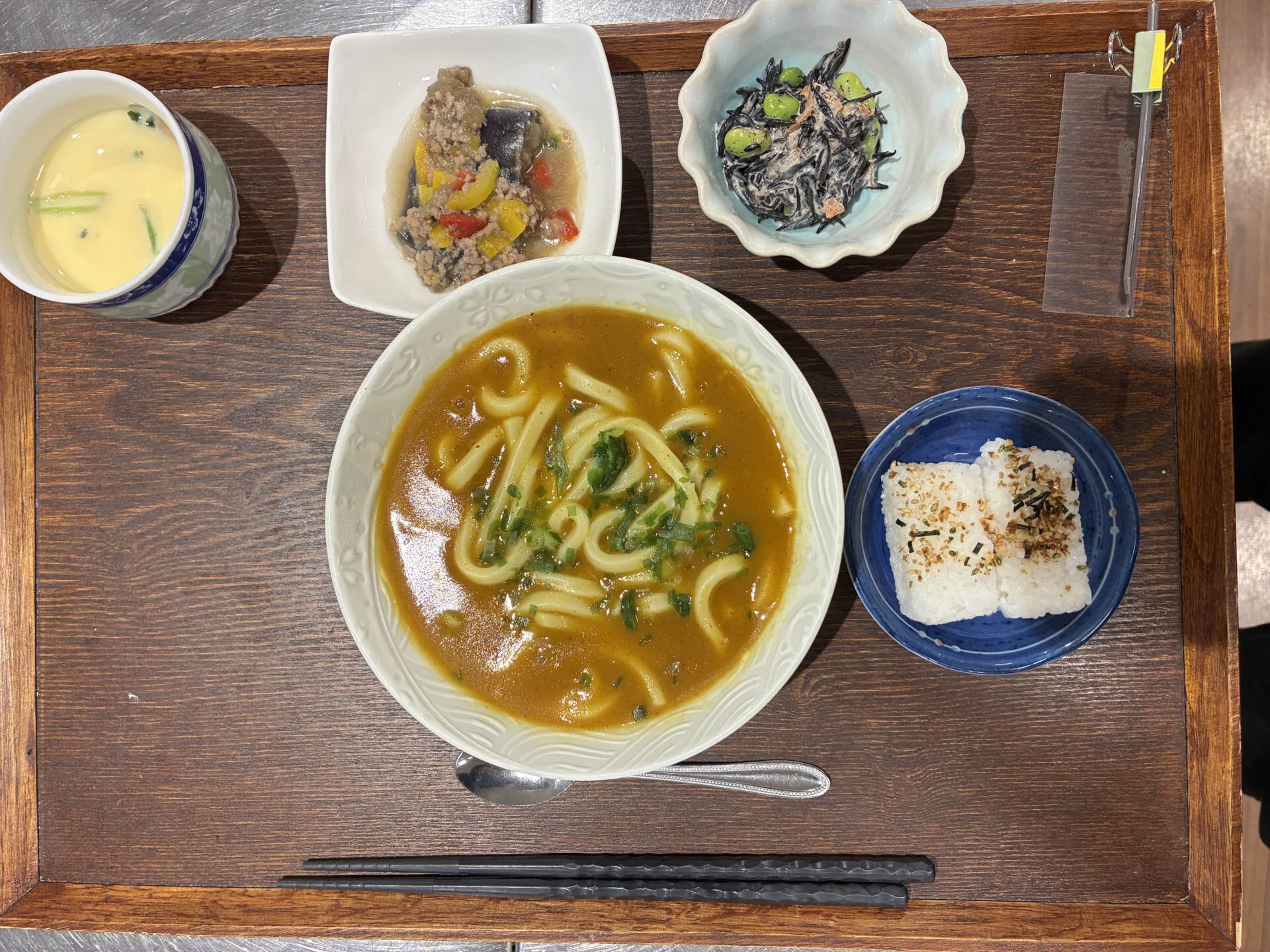 付け合わせは、おにぎり・茄子のボロネーゼ・ひじきと枝豆のサラダ・茶碗蒸しです。