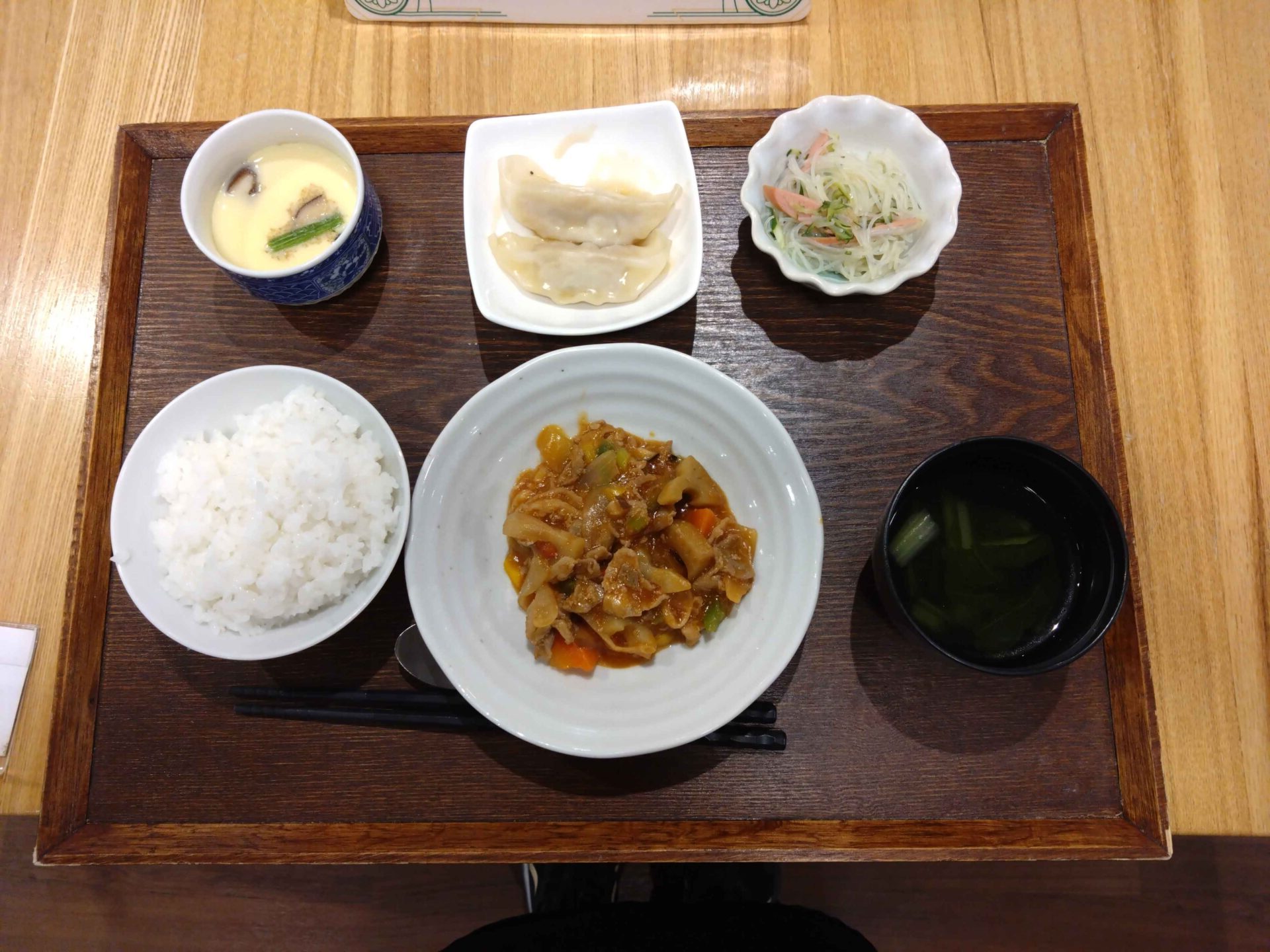 付け合わせは、ごはん・餃子・春雨の中華和え・中華スープ・茶碗蒸しです。
