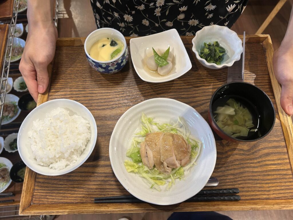 付け合わせは、ごはん・里芋の煮っ転がし・小松菜の辛し和え・すまし汁・茶碗蒸しです。
