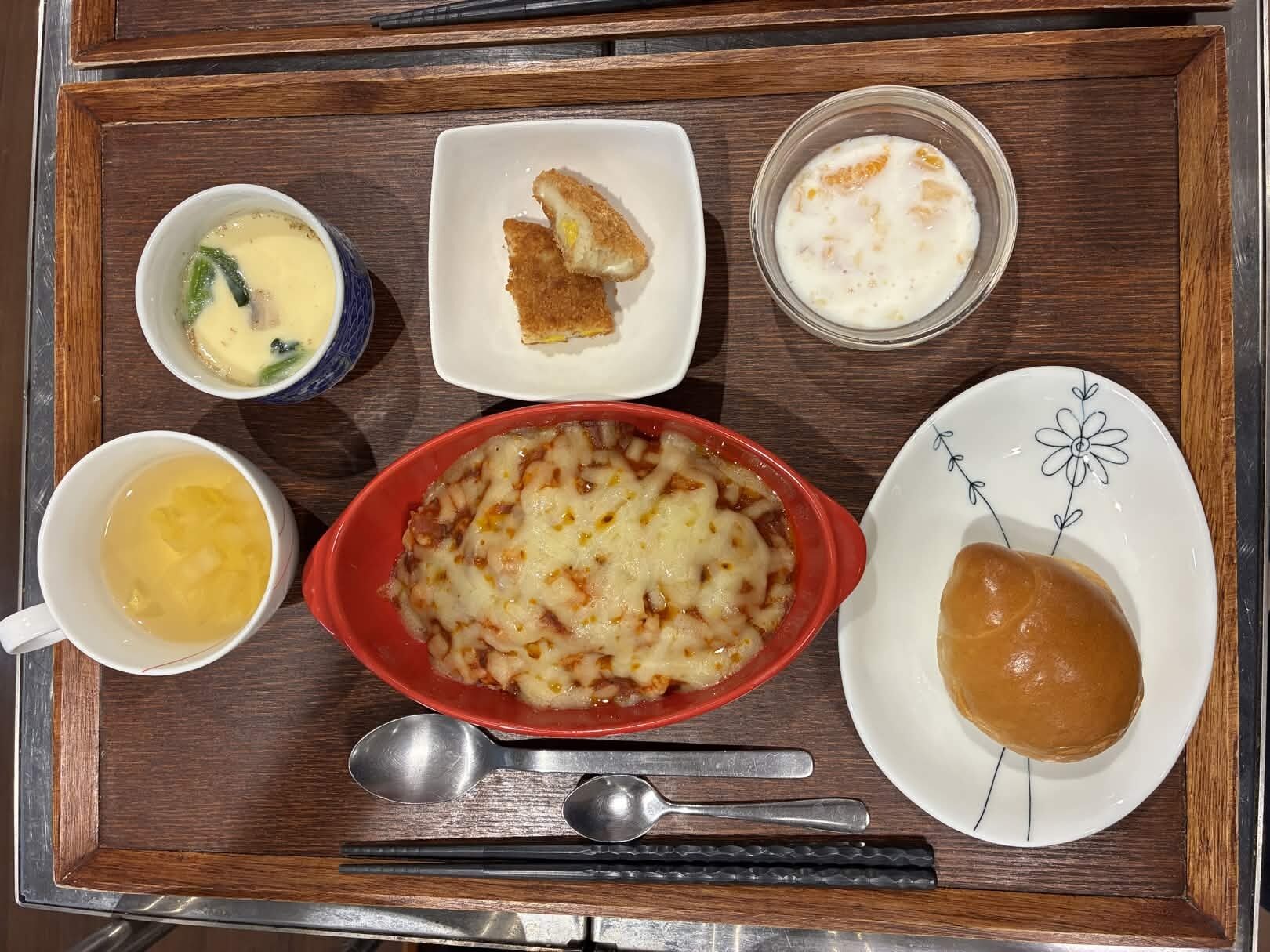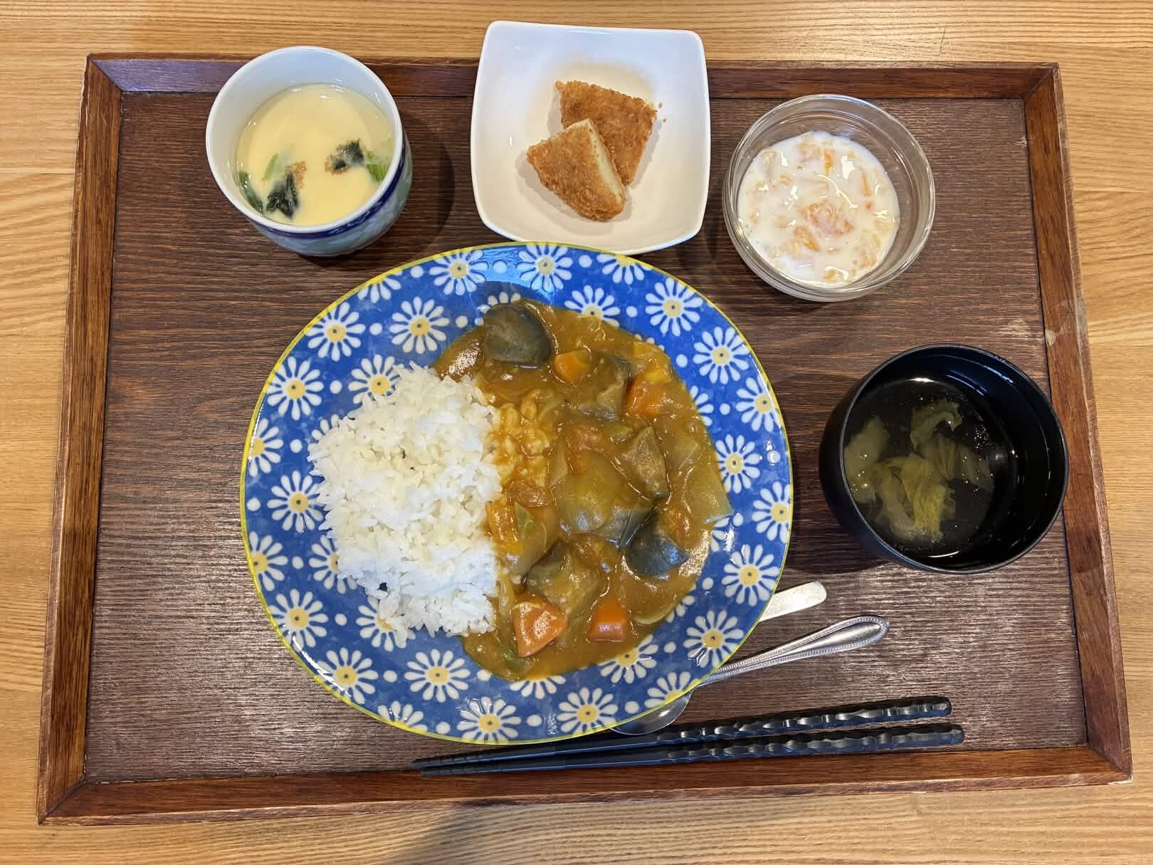 付け合わせは、ごはん・白身魚のフライ・フルーツヨーグルト和え・コンソメスープ・茶碗蒸しです。