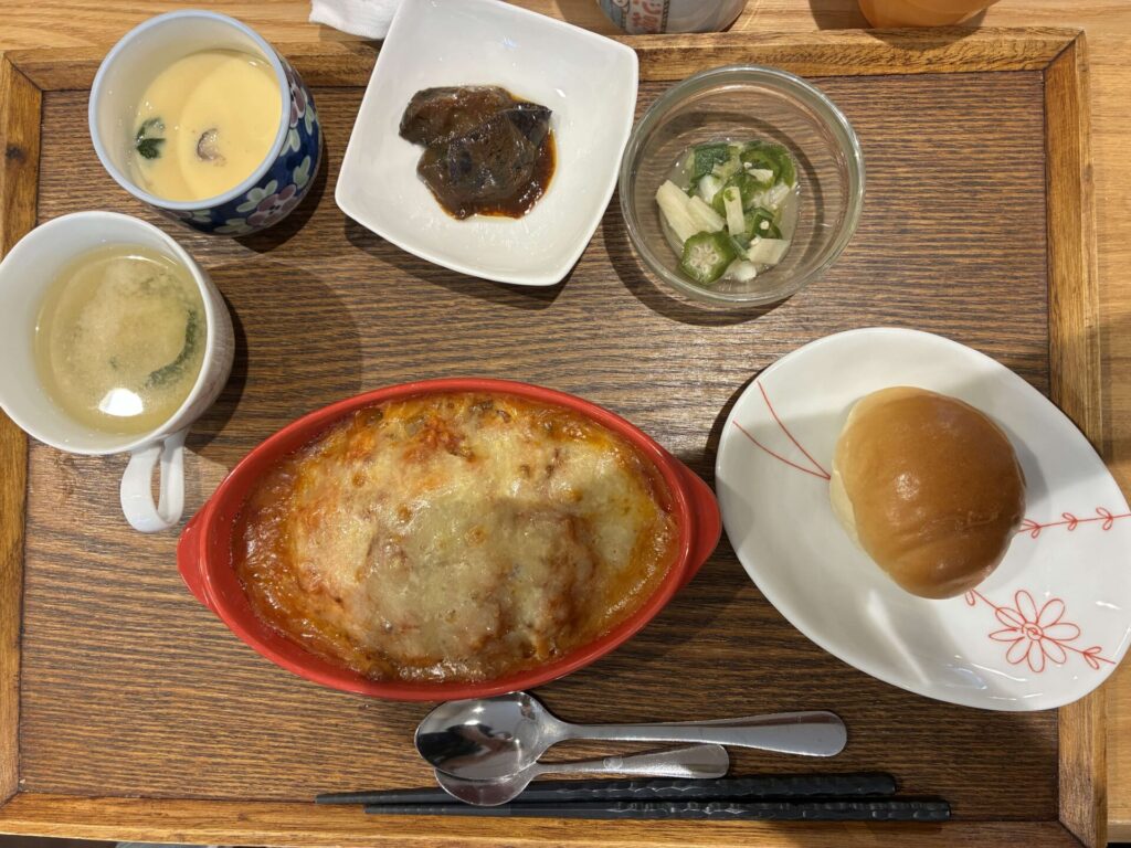 付け合わせ、パン(ごはんにも変更可能です)厚揚げの甘辛煮・いんげんの胡麻和え・味噌汁です。