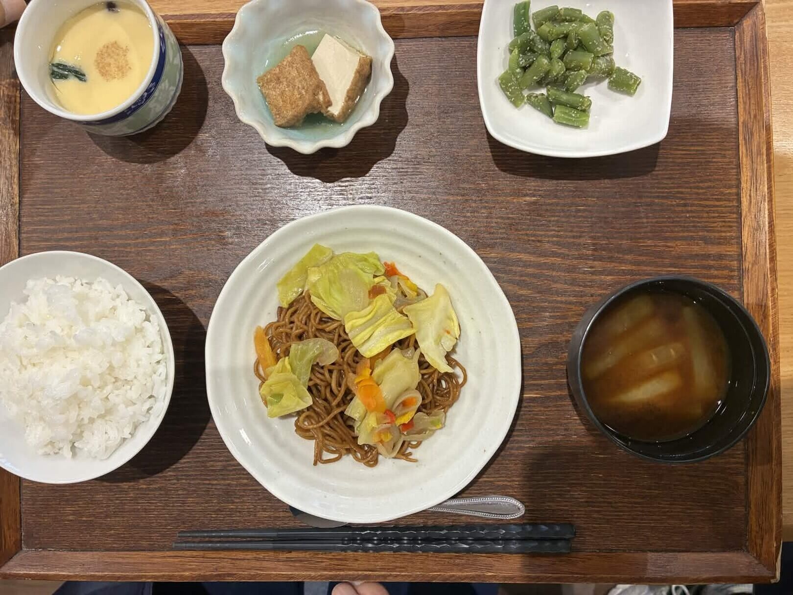 付け合わせは、おにぎり・厚揚げの甘辛煮・いんげんの胡麻和え・茶碗蒸しです。