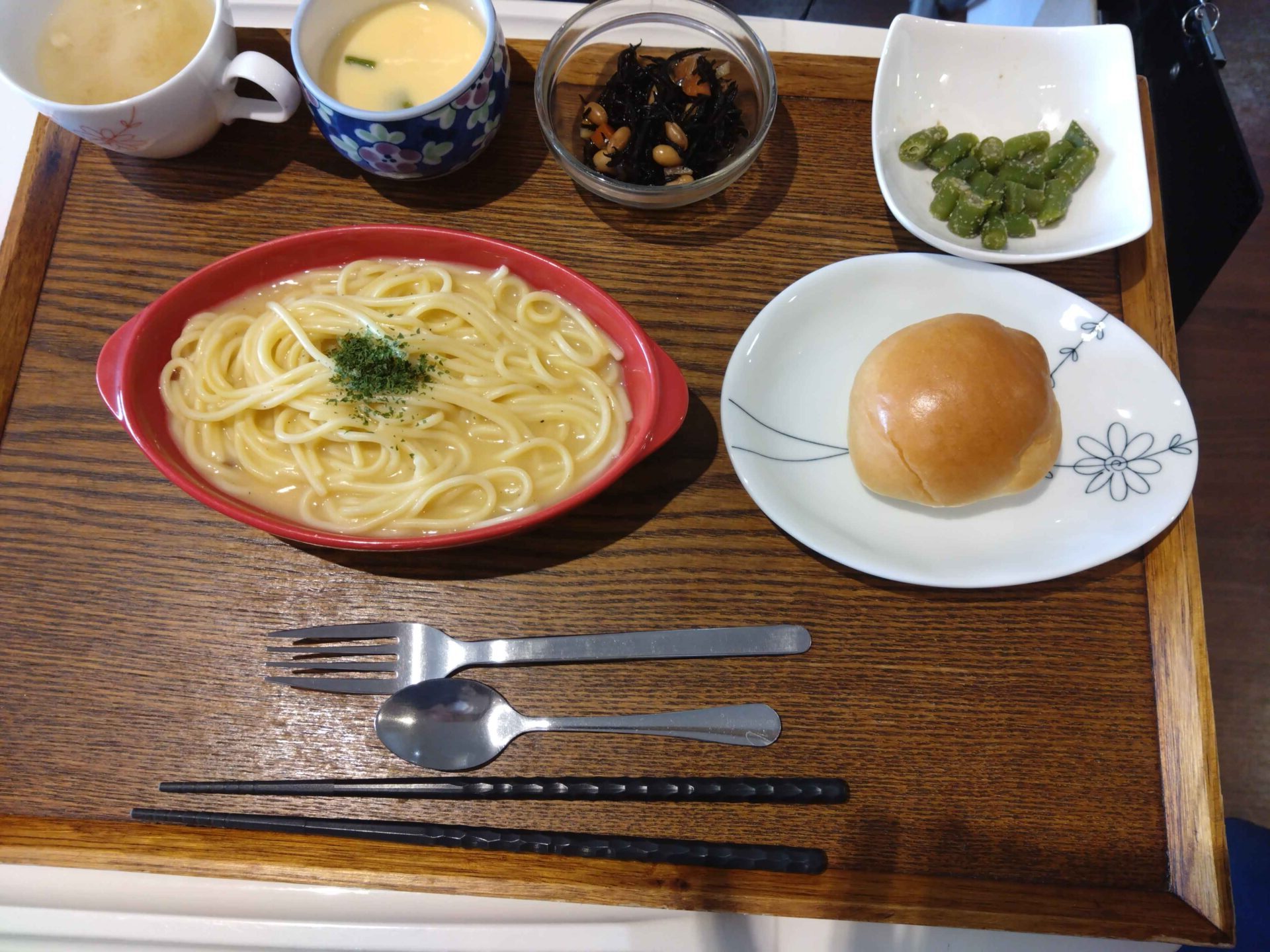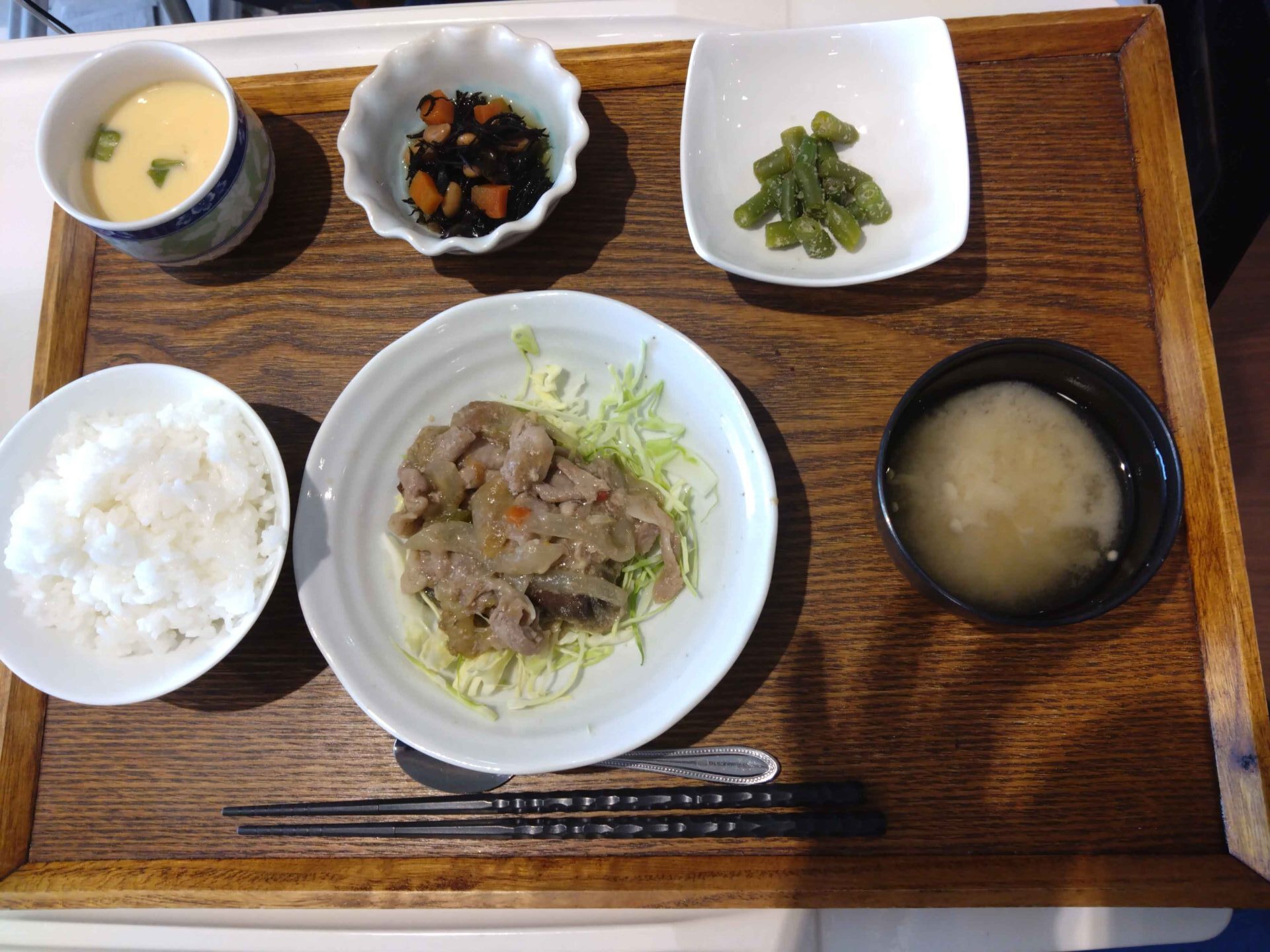 付け合わせは、ごはん・ひじき豆煮・いんげんのピーナッツ和え・味噌汁・茶碗蒸しです。